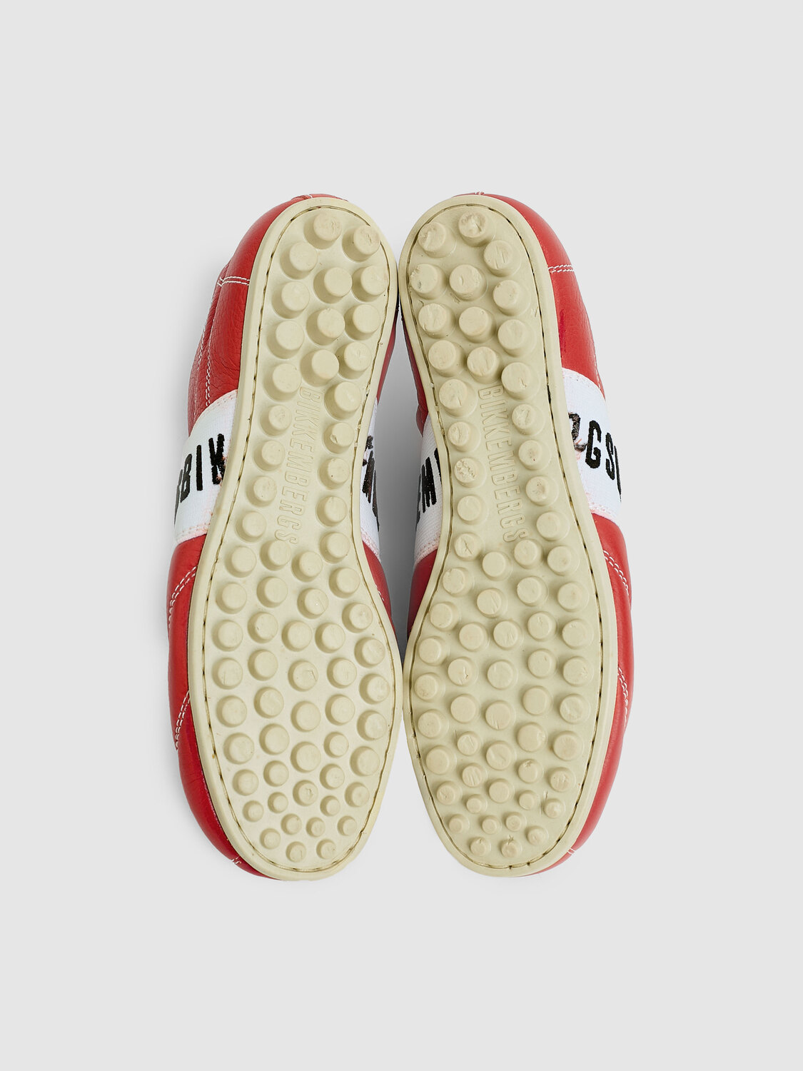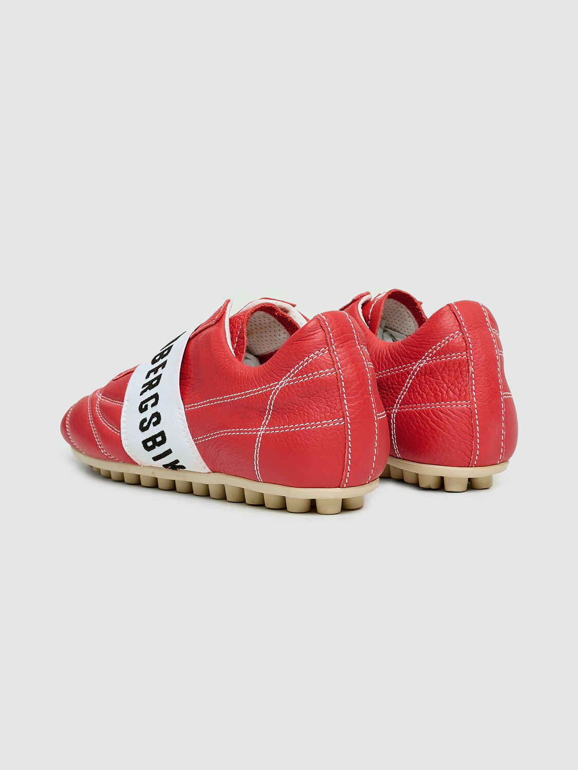 Bikkembergs red leather sneakers with football-boot inspired design, black and white velcro logo straps and spiked rubber sole.