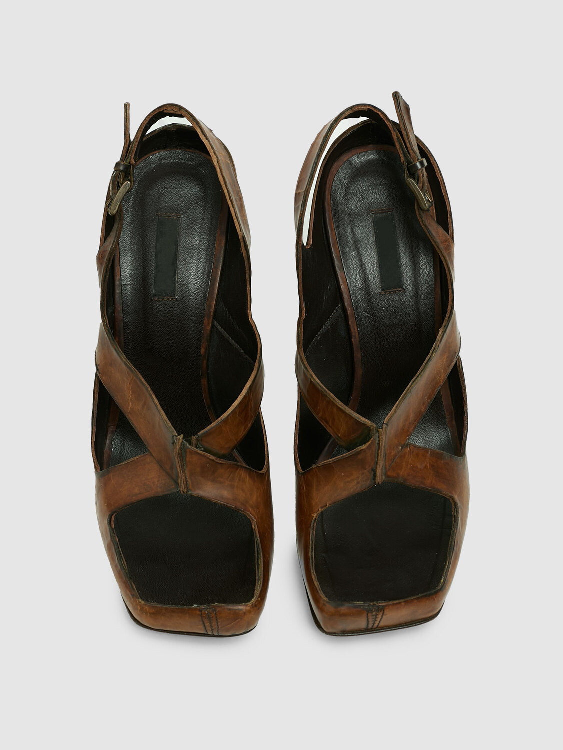 Brown distressed leather recessed effect square-toe heels with ankle straps.