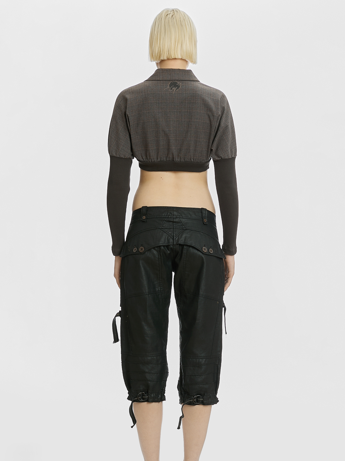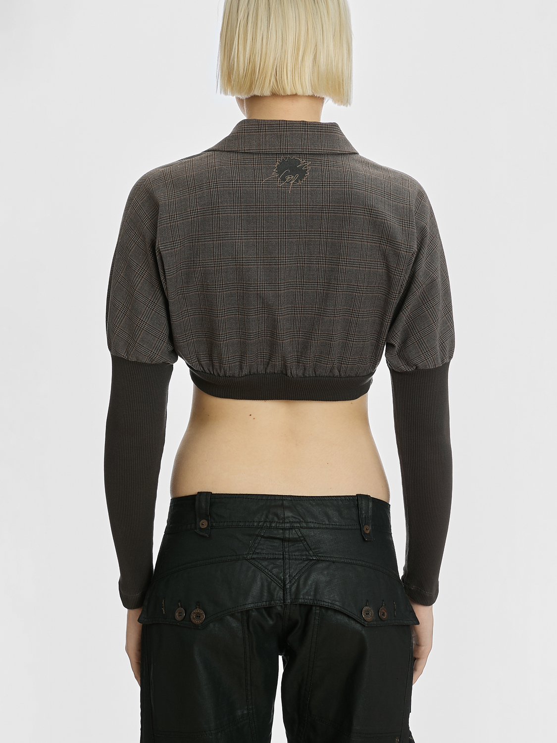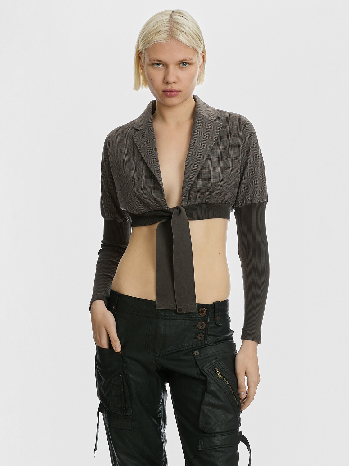 Cop Copine brown tweed pattern cropped jacket with rib cotton sleeves and hem. Ties at the front.