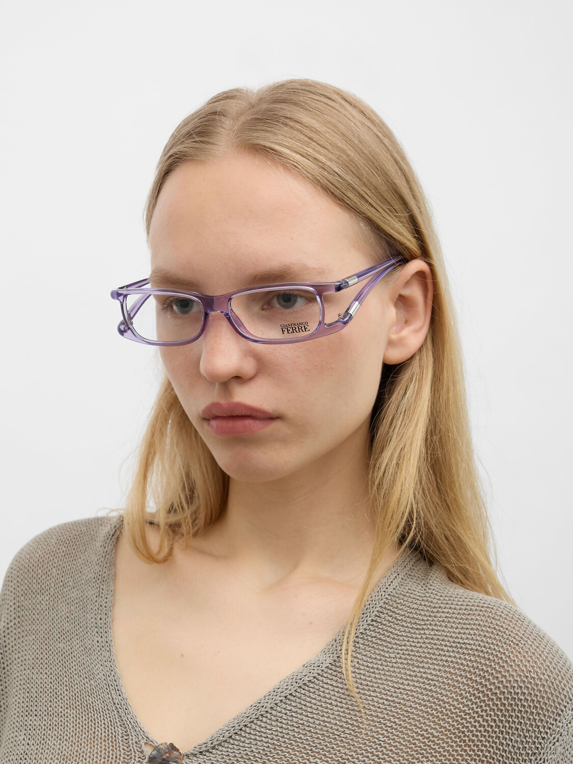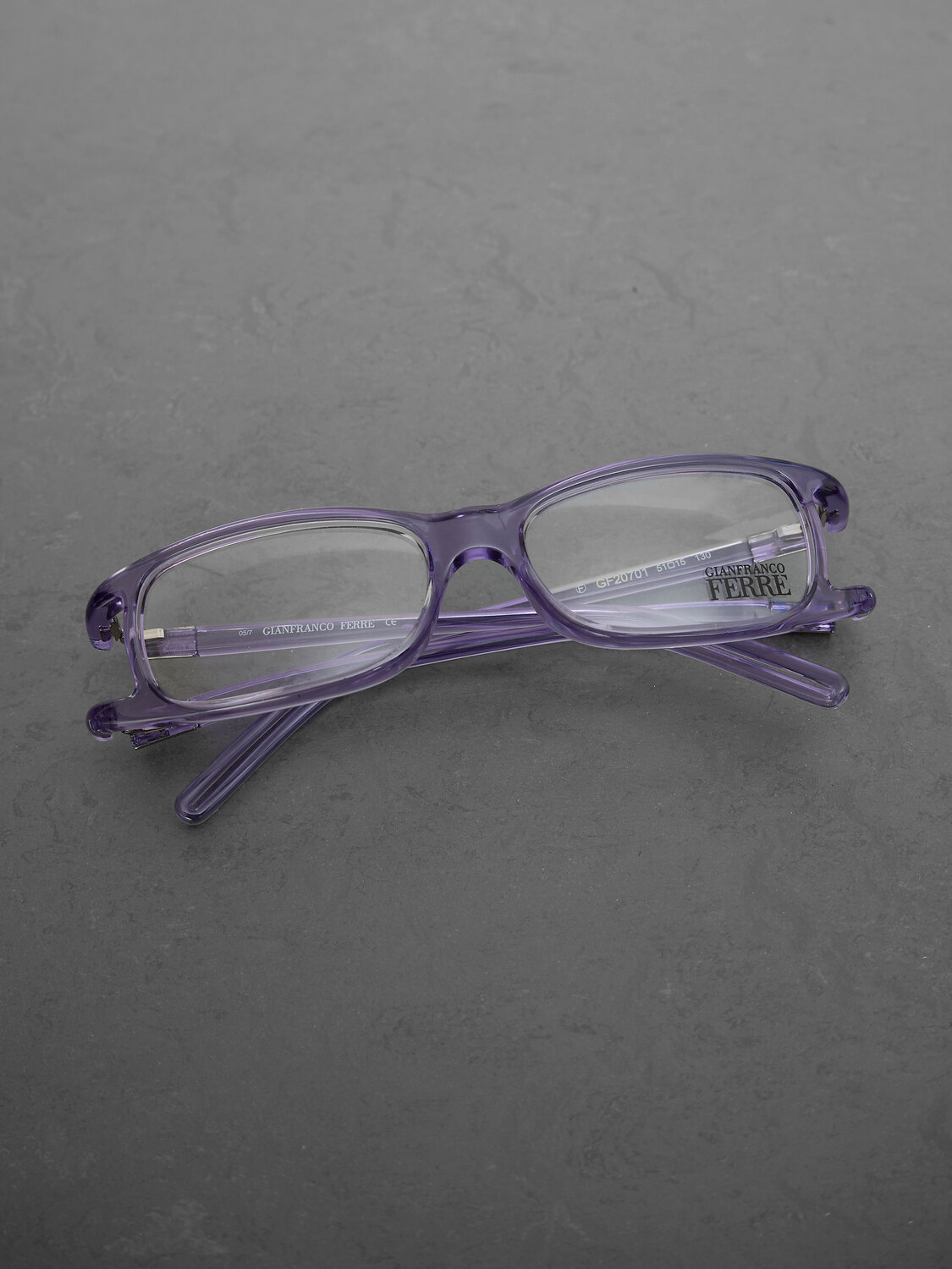 Gianfranco Ferre rectangular glasses encased in a lavender transparent plastic frame. Silver-tone details on the temples.