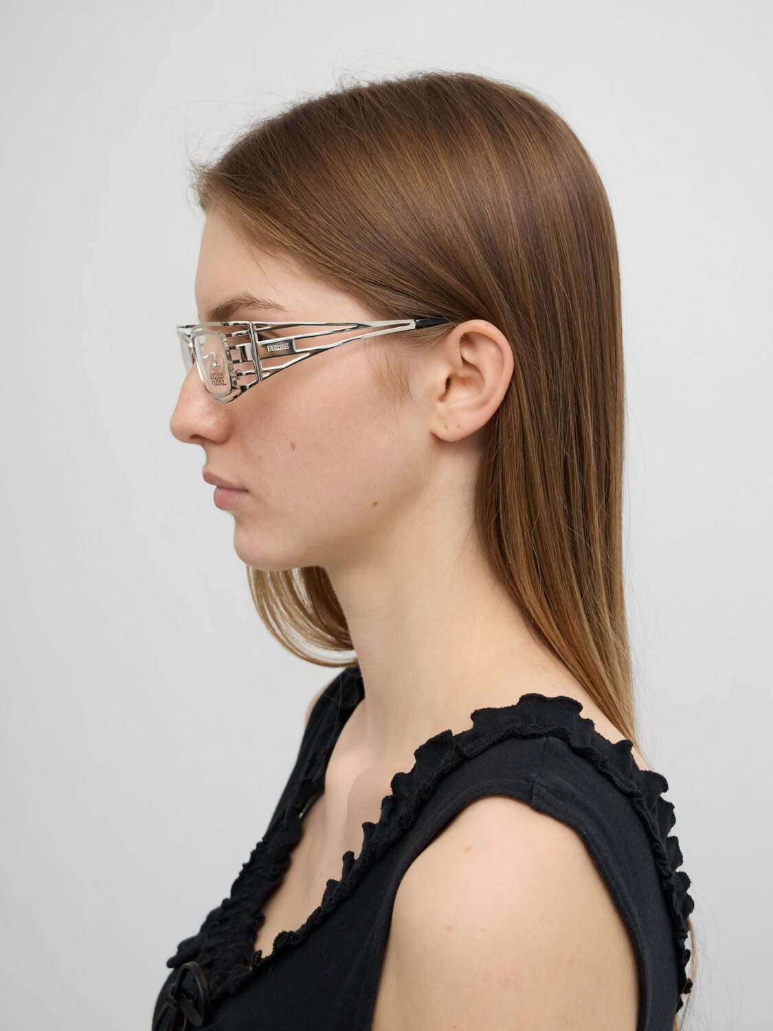 Gianfranco Ferre rectangular glasses encased in a silver-tone metal “cutout” frame. Logo on the temples.