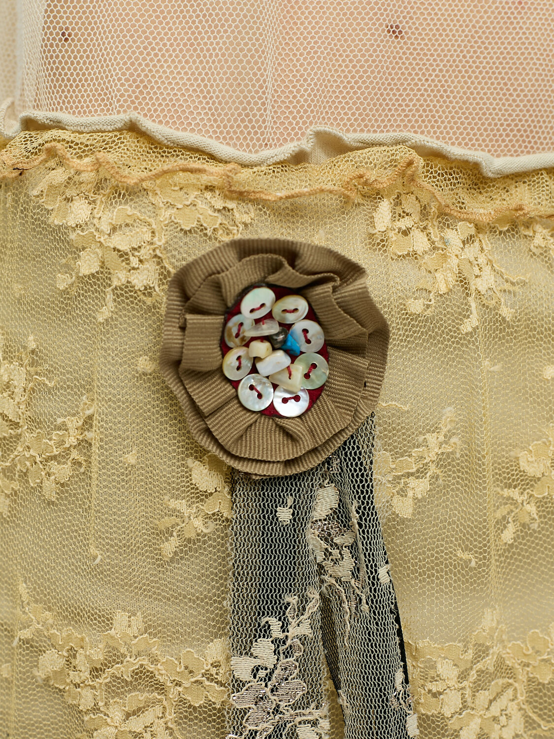 Anna Sui beige lace mini skirt with a rosette appliqué . Elasticated waist. Grey cotton lining.