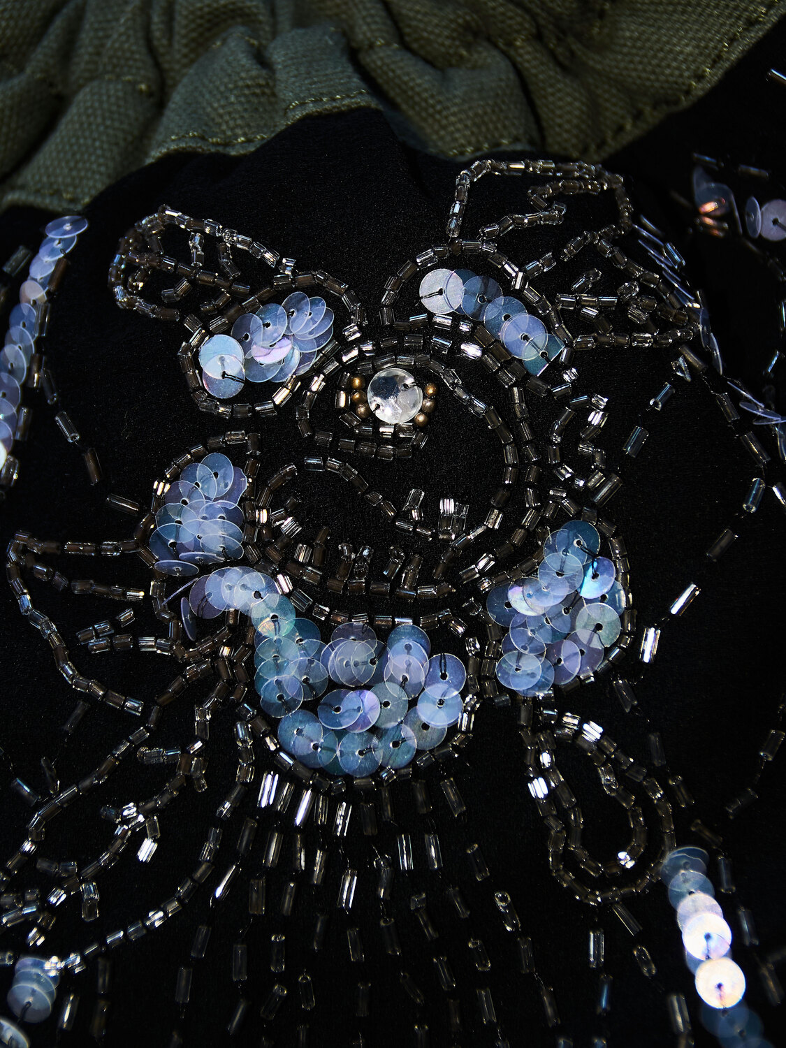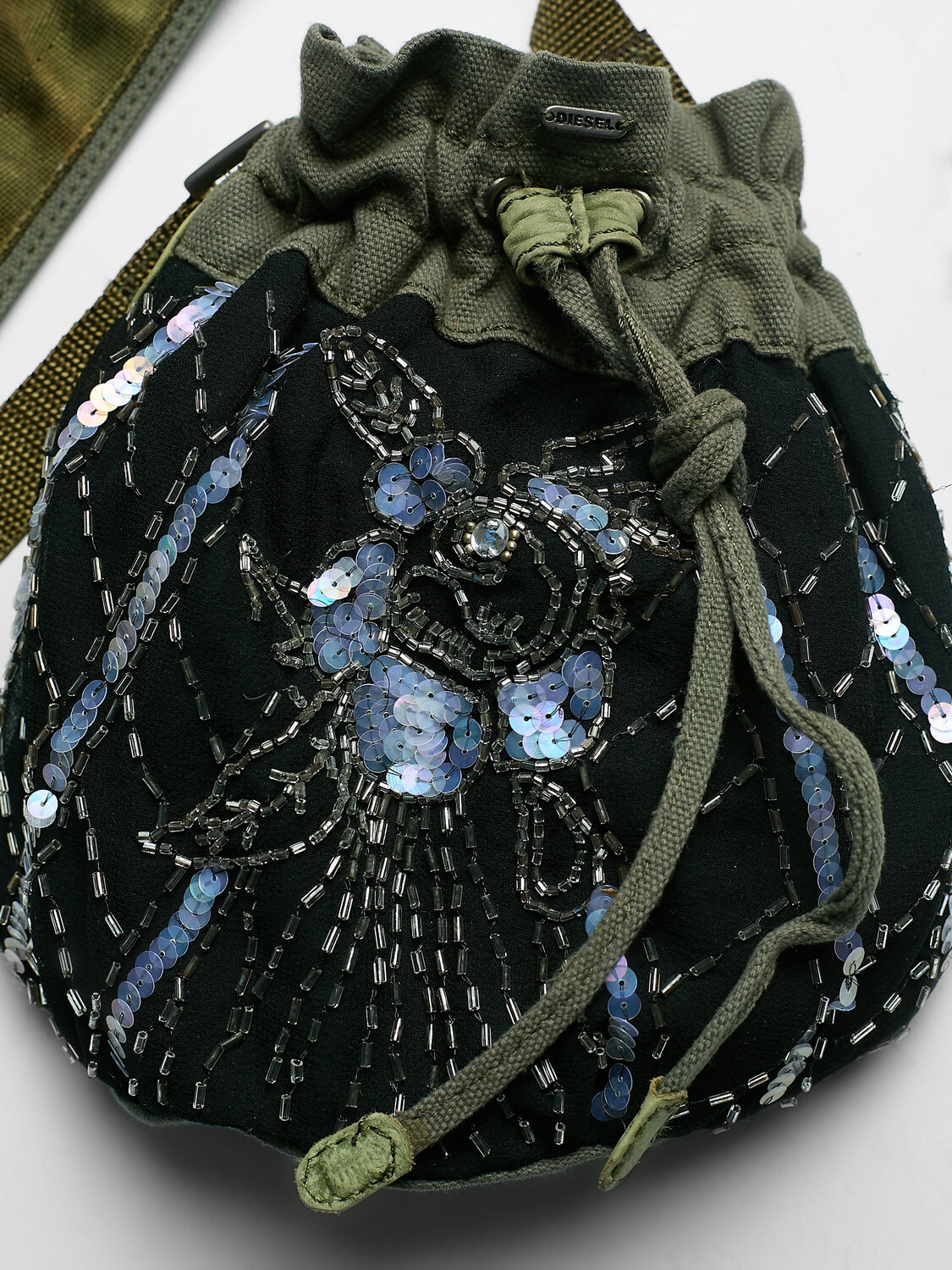 Diesel mini shoulder bag in black chiffon material with embellished beaded and sequinned floral patterns. Khaki green canvas strap with utility belts, clasps and hooks. Olive green leather reinforcements around seams. Small internal zipper pocket.