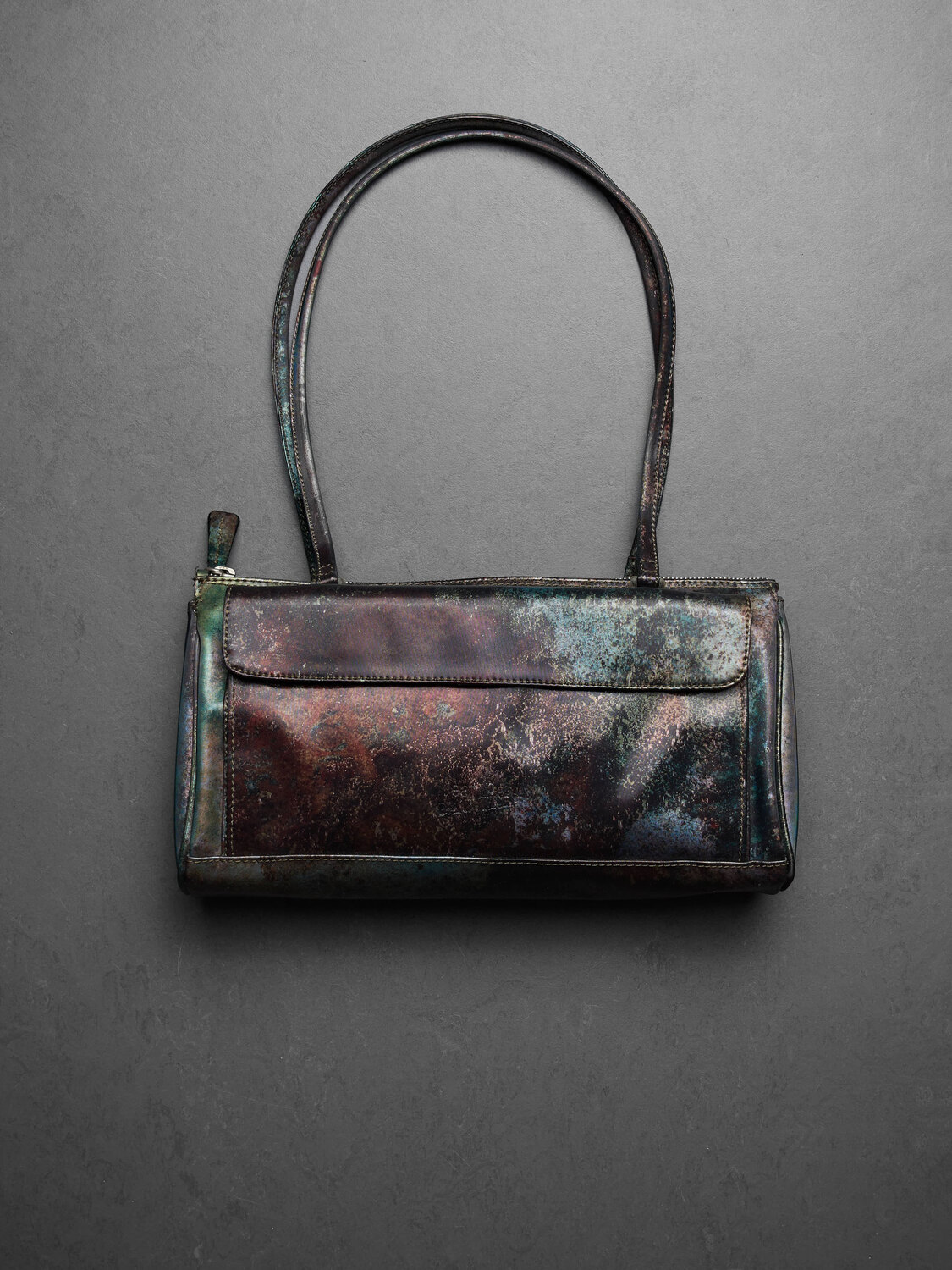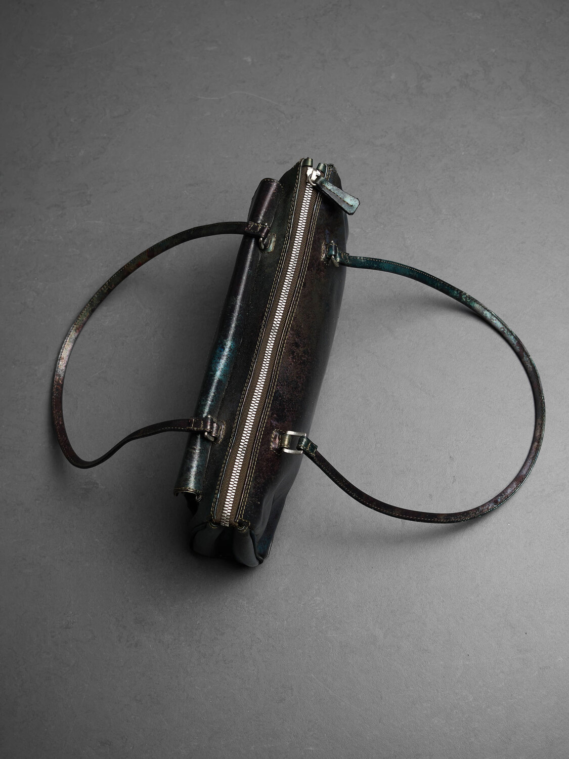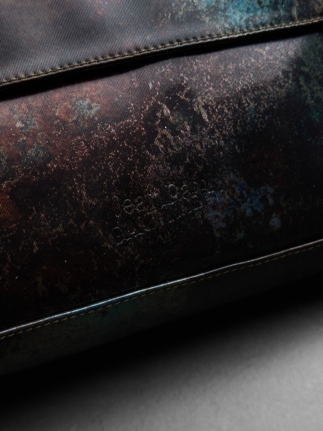 Jean Paul Gaultier 90s Cyber collection handbag featuring holographic PVC body with patinated copper print, matching trim and handles. Front pocket with magnetic snap buttons closure. Zip-up top closure. Green nylon letter print lining with zippered interior pocket. Silver-tone hardware.