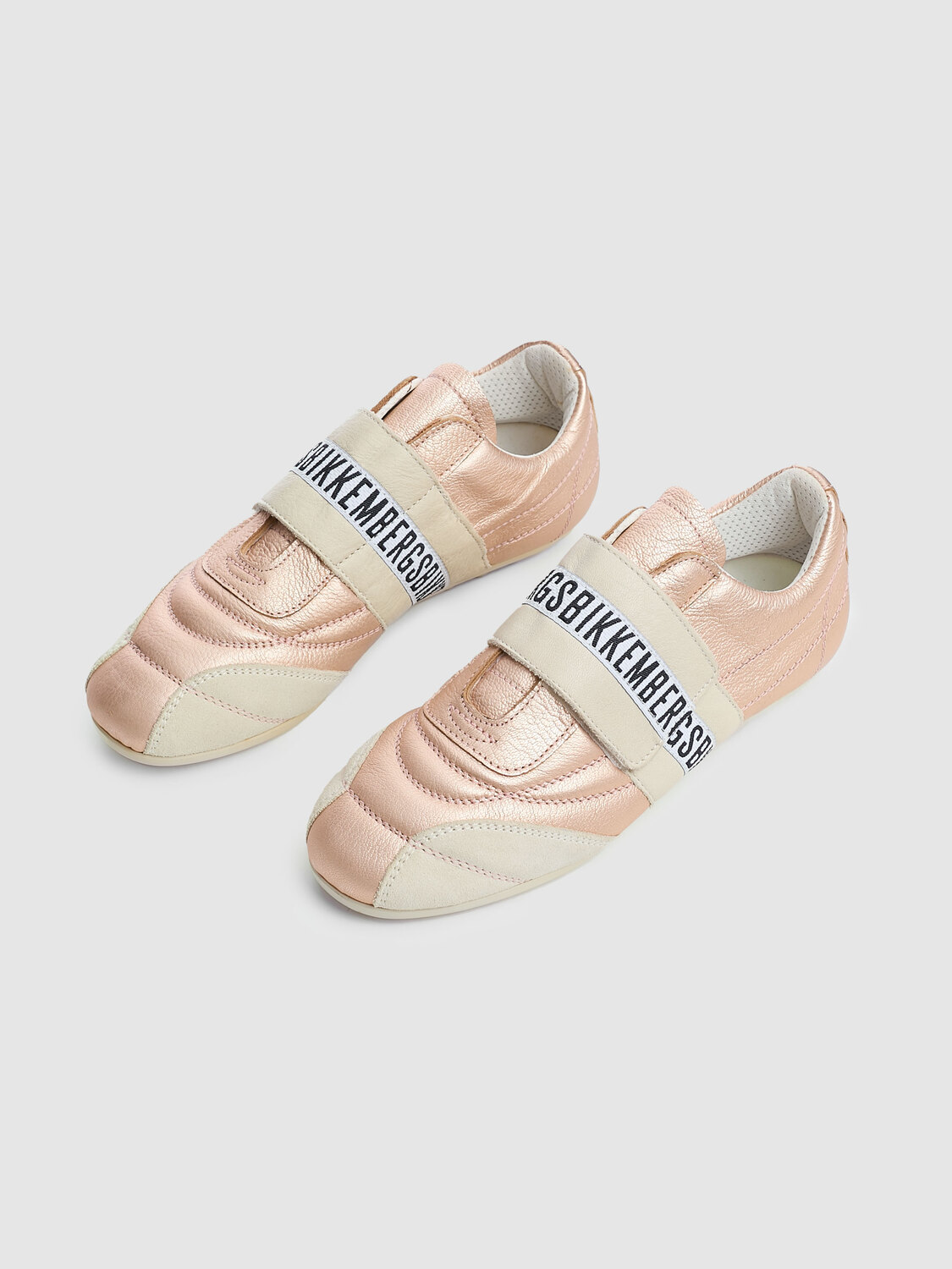 Bikkembergs pink metallic leather and cream suede sneakers with football-boot inspired design, velcro closure with logo strap and cream spiked rubber sole. White sports mesh lining.