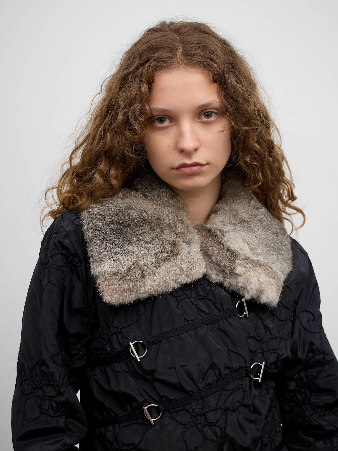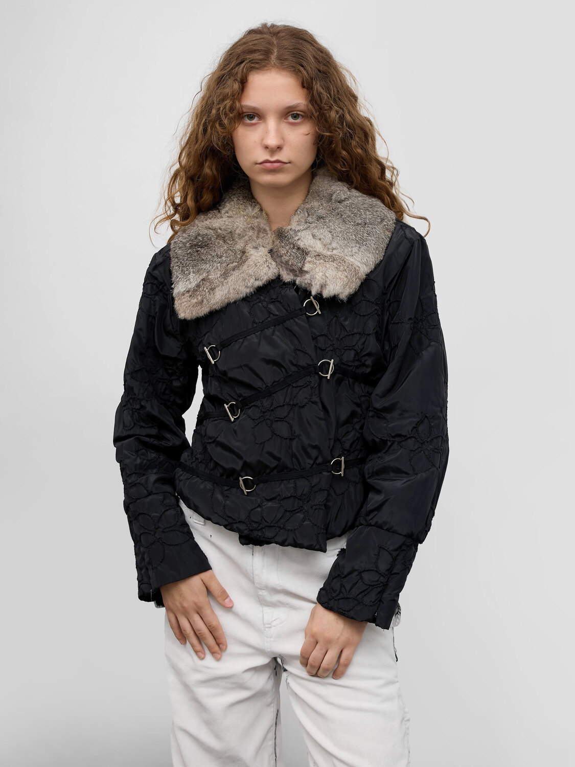 Black nylon lightly padded jacket featuring a button closure, a floral embroidery all over and decorative asymmetrical straps. Removable faux fur collar.