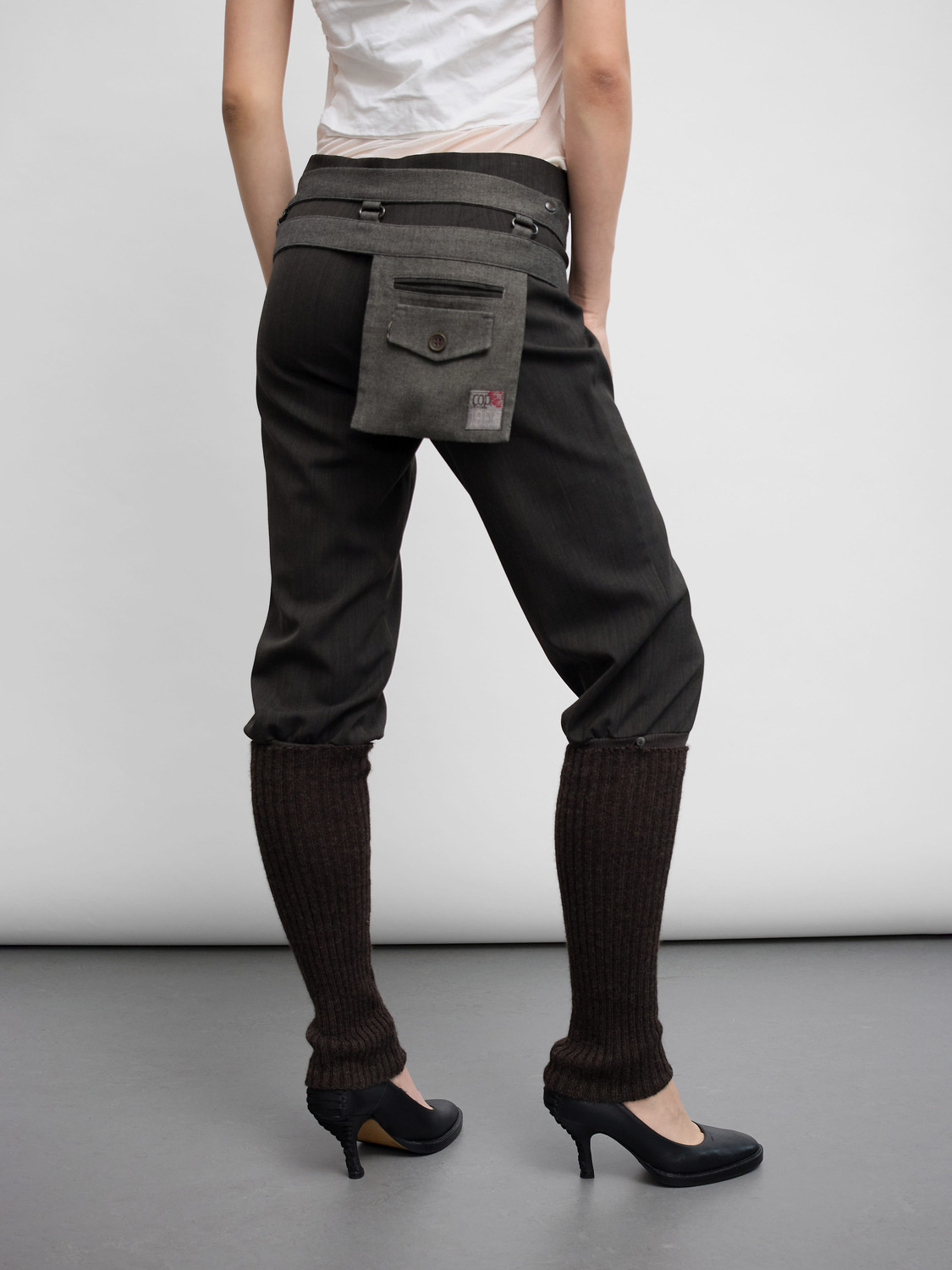 Cop Copine brown and grey capri trousers featuring removable belt with a pocket and rib knit removable gaiters.