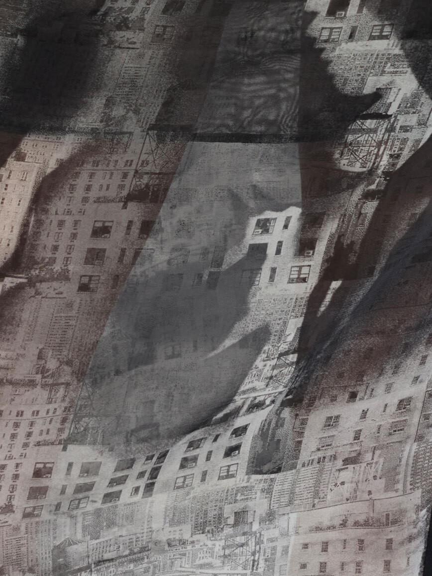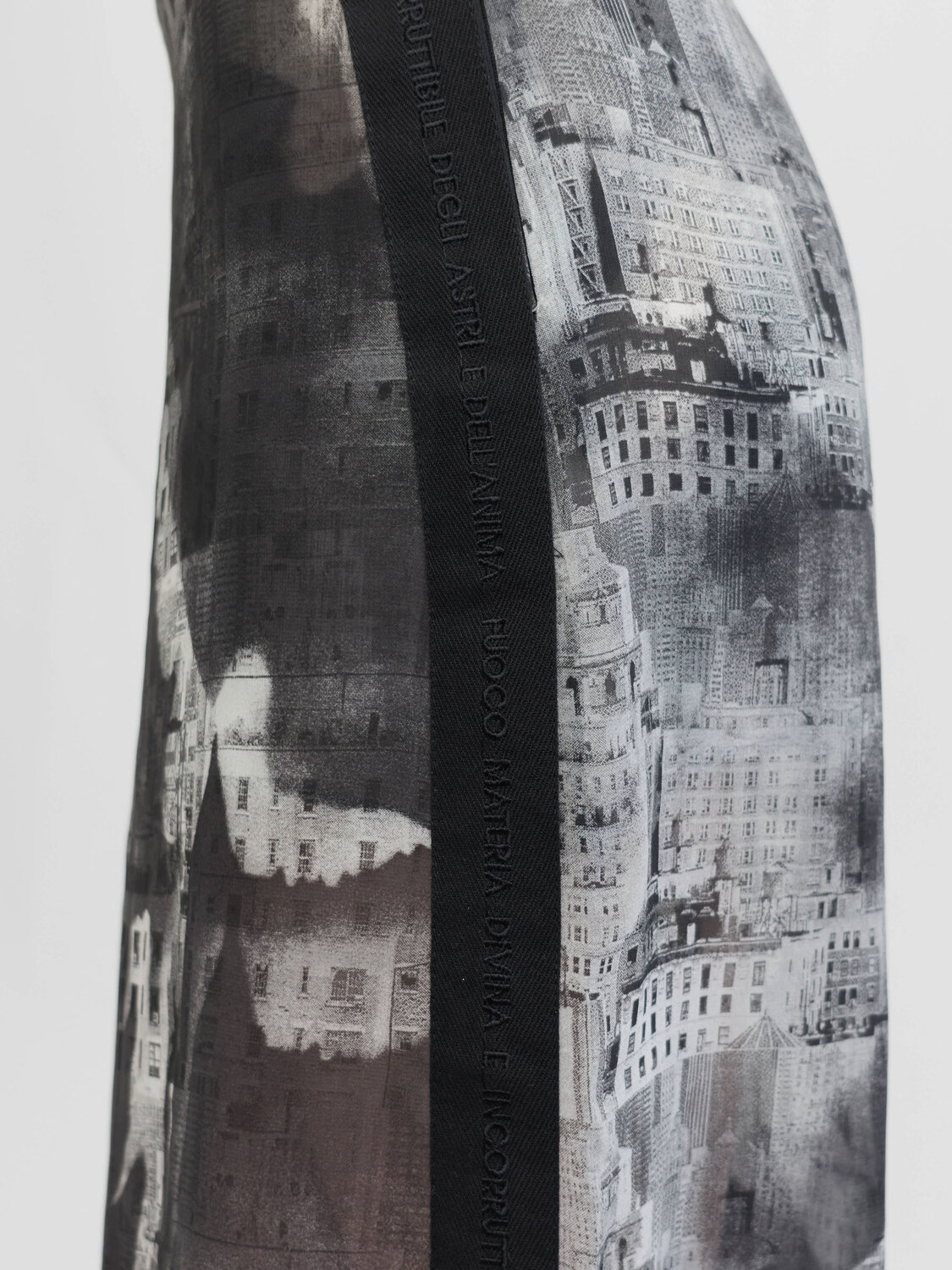 E-Play monochrome chiffon midi skirt with a cityscape print and black canvas stripes on the sides. Concealed zipper closure on the side.