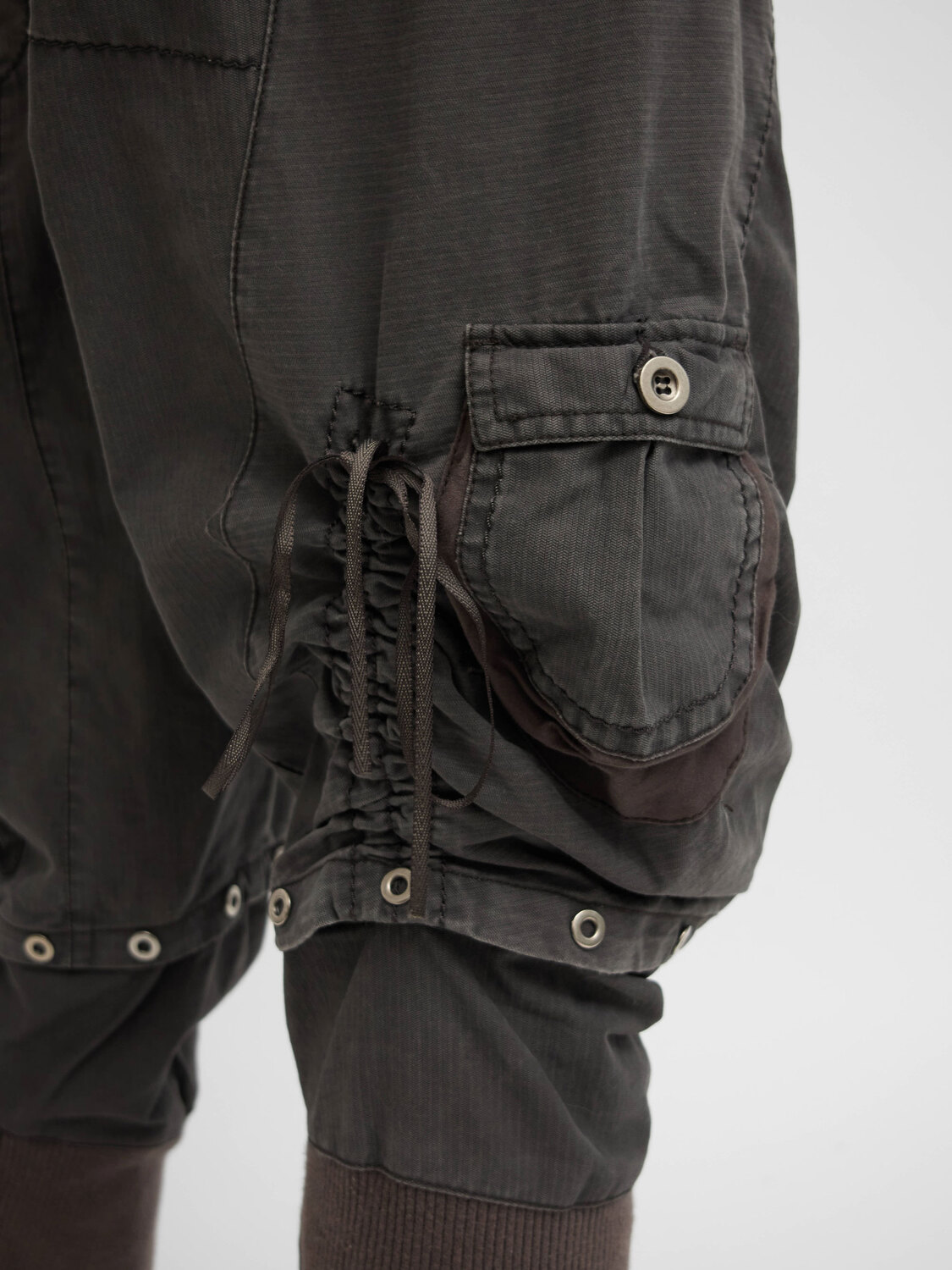 Marithé+François Girbaud grey and khaki cargo capris with multiple front and rear pockets, gathered details, zip-adjustable rib-knit hems. Removable bottom sections for a shorter length.