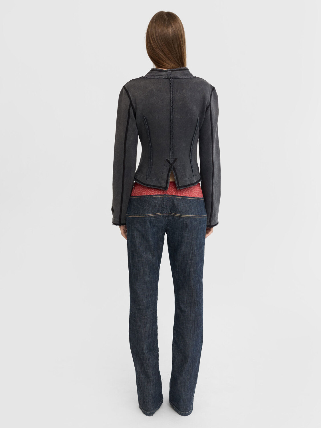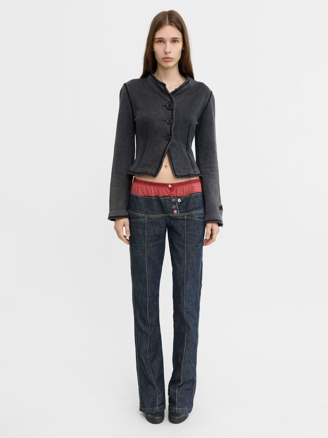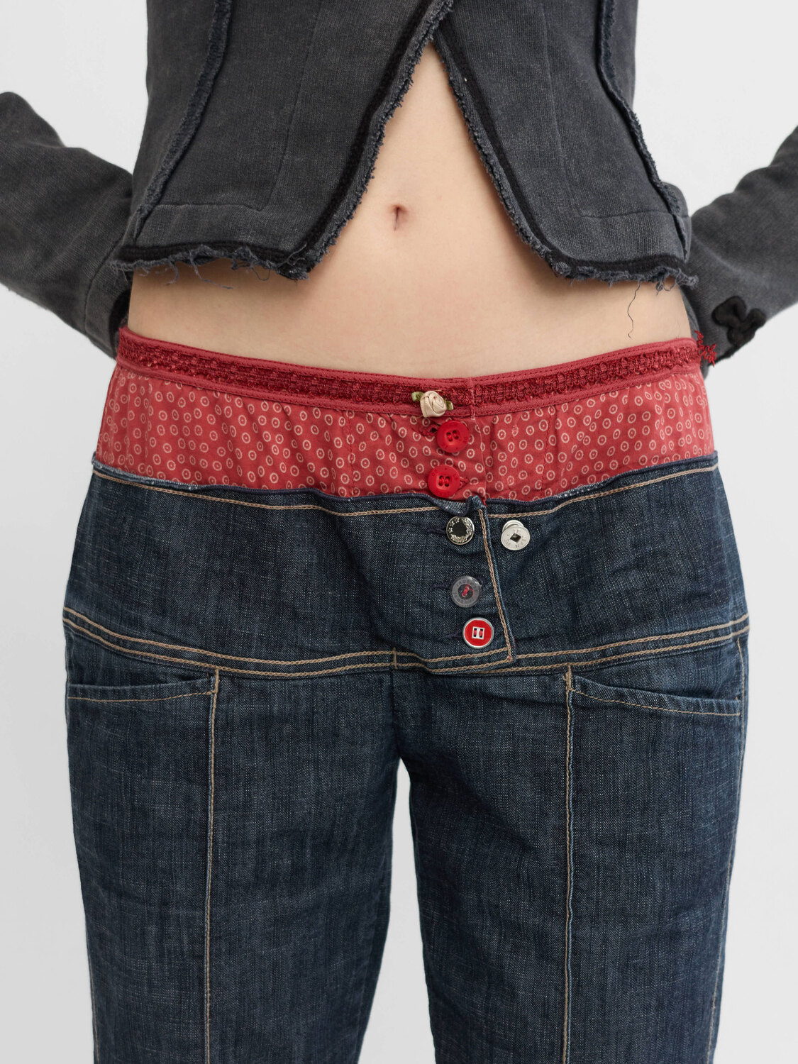 Marithé+François Girbaud navy blue and red double waist effect low rise jeans.