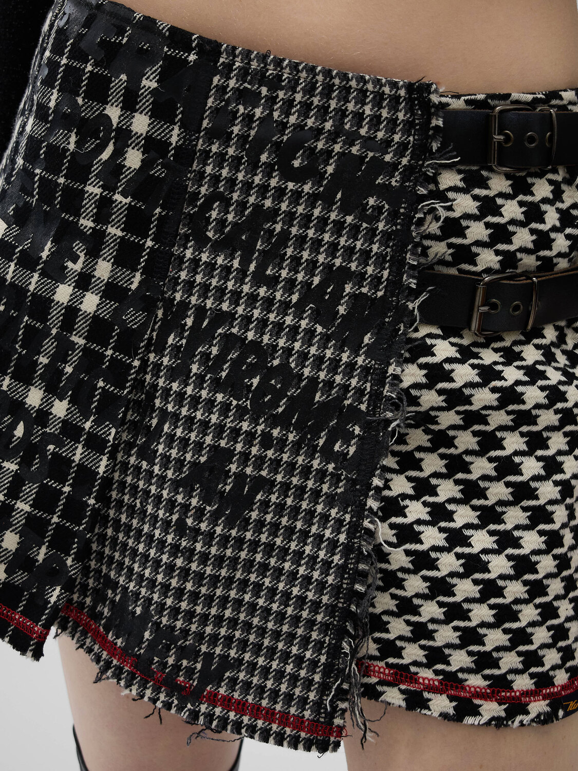 Killah wrap around mini skirt made of different types of houndstooth fabrics. Kilt-inspired look with two leather straps. Red overlock seam on the bottom. Black letters printed all over.