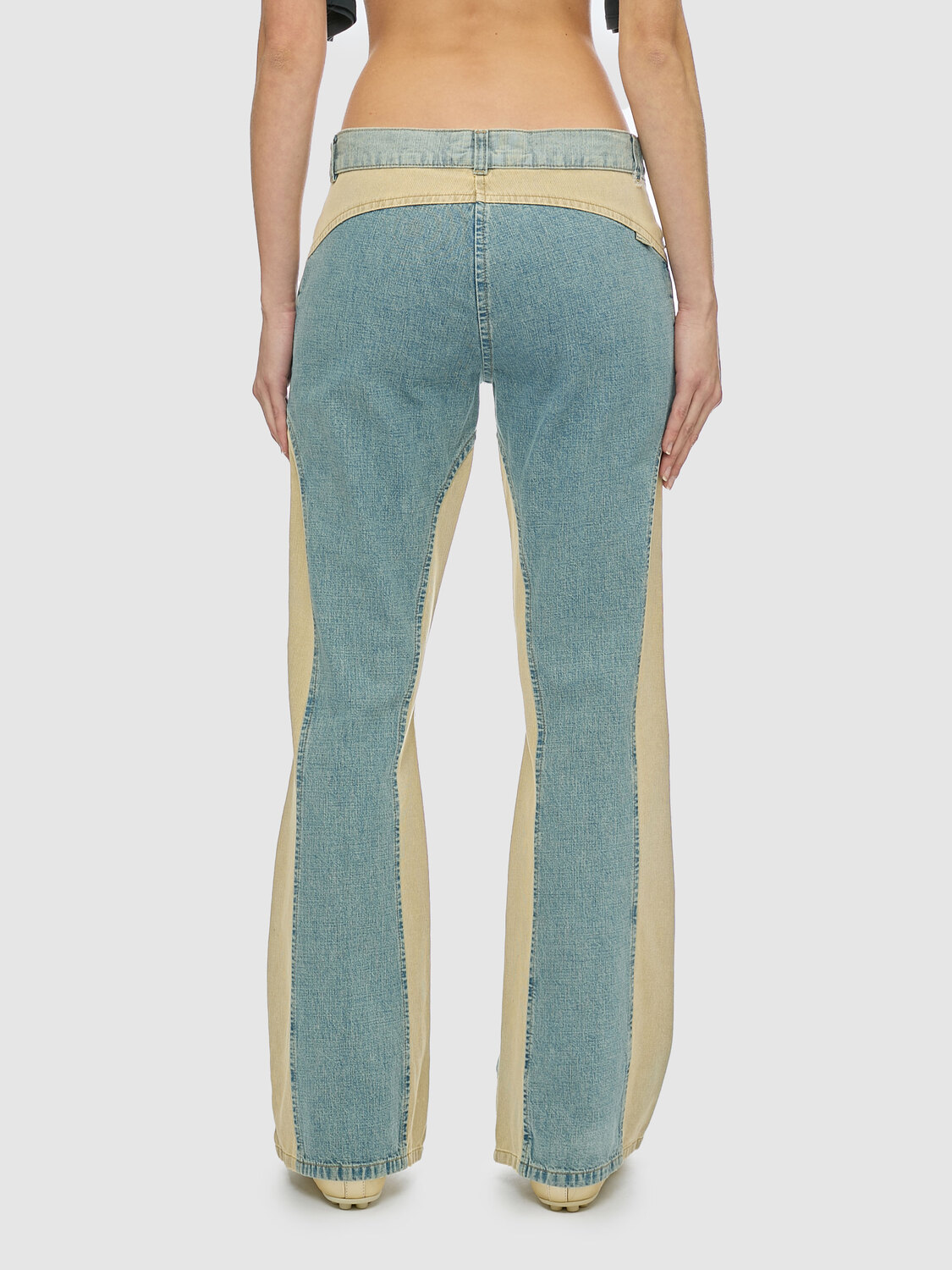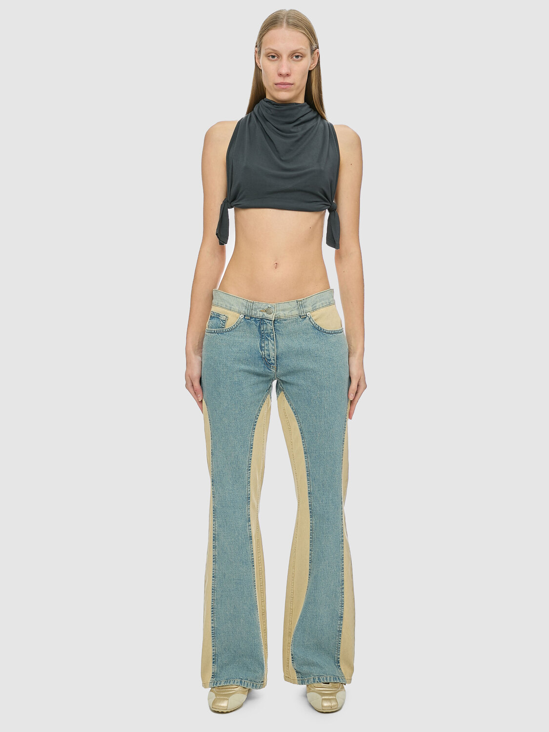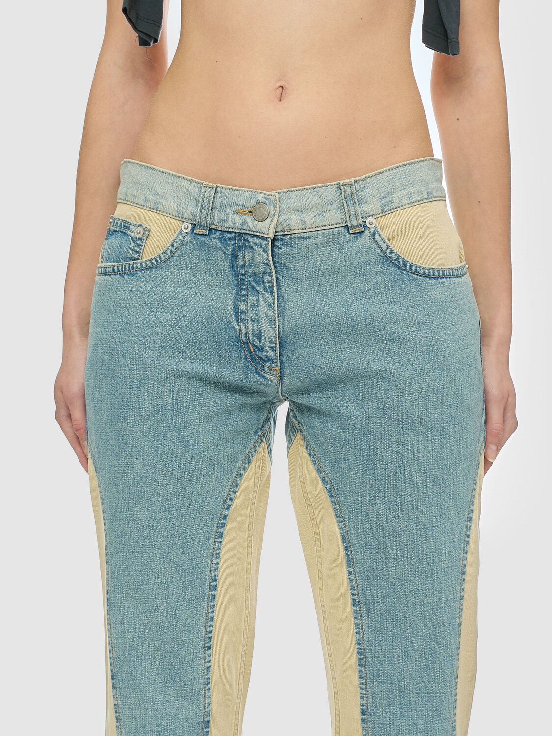 Tom Taylor flared jeans featuring corduroy panels with all-around accentuating body curves. Featuring silver metal hardware and pockets on front.