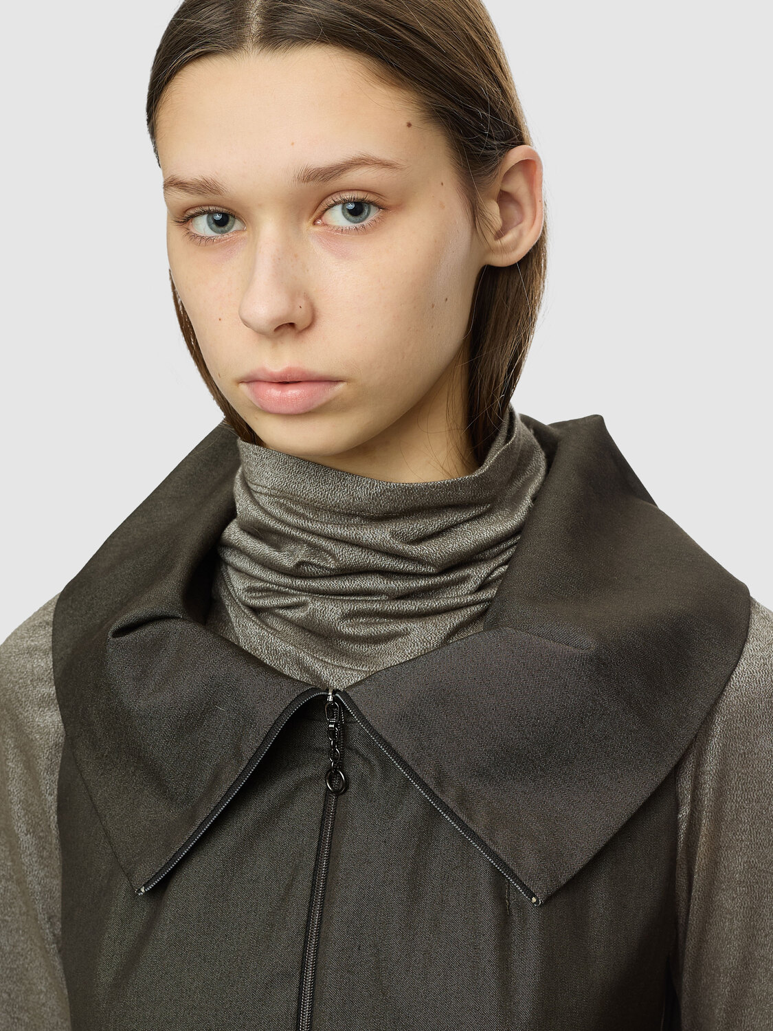 Cop Copine layered dress consisting of silver turtleneck midi dress with fuzzy-knit cuffs and a separate dark grey vest dress with zip closure, a belt, a large collar and two back pockets.