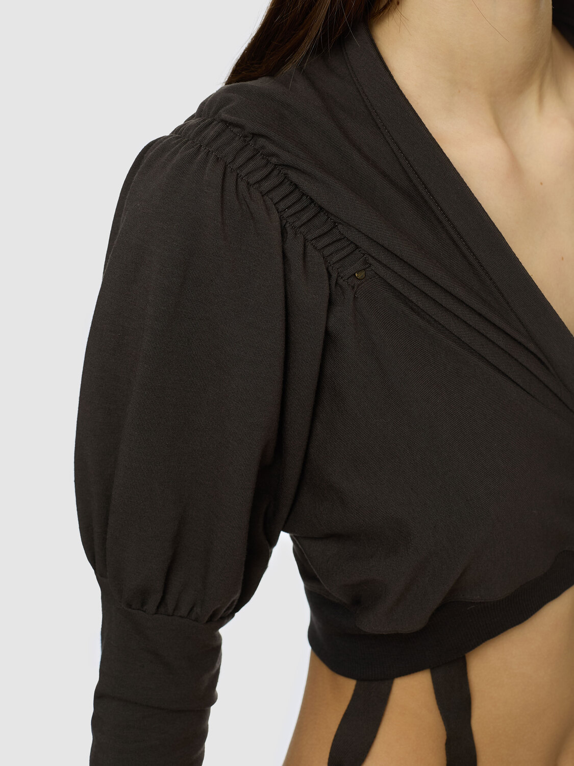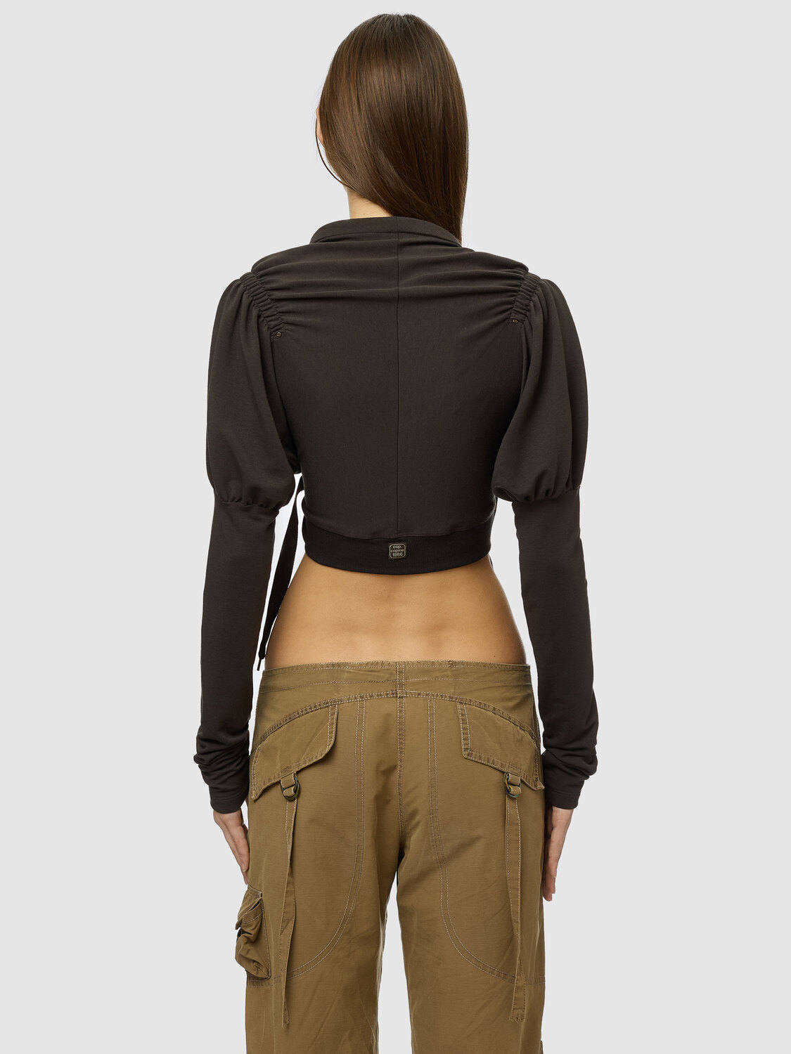 Cop Copine grey cardigan with gathered detail at shoulders and sleeves, elasticated rib-knit waist and canvas drawstrings.