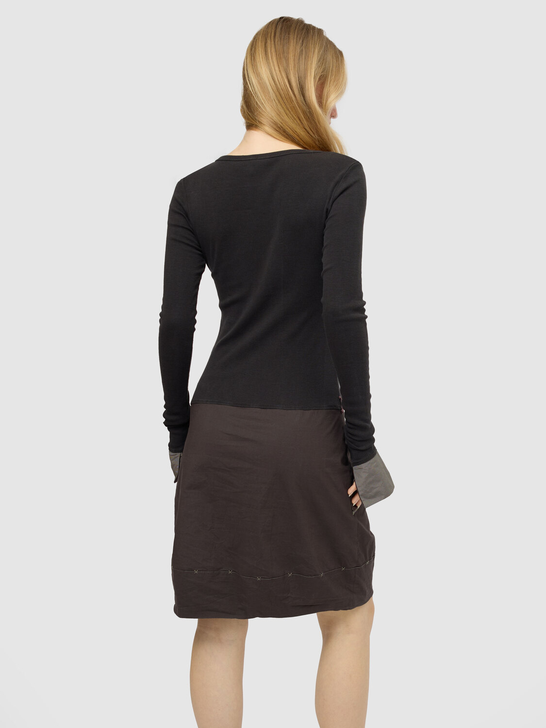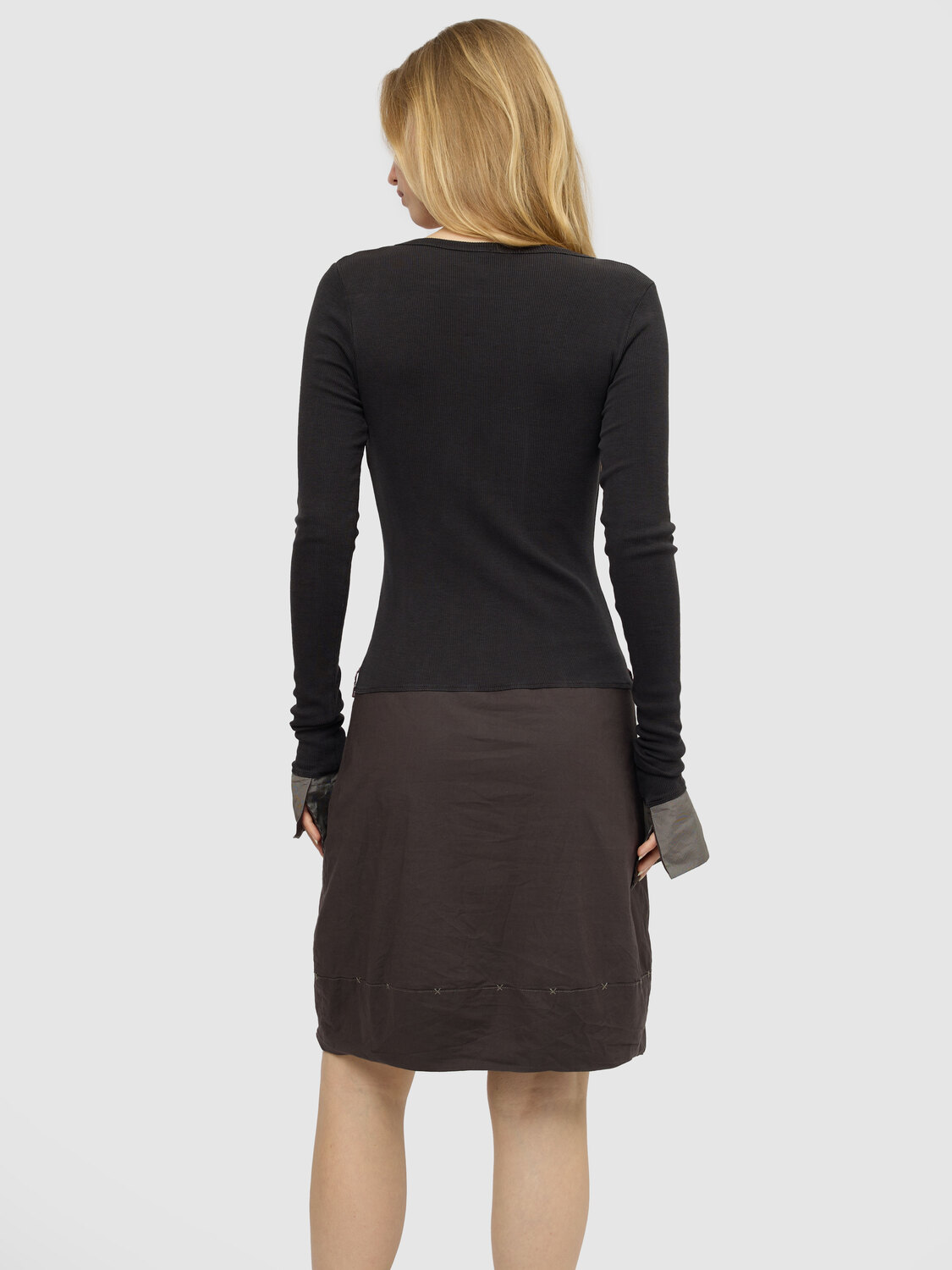 Cop Copine grey rib knit midi dress. Button-up collar. Chequered shirt cuffs.