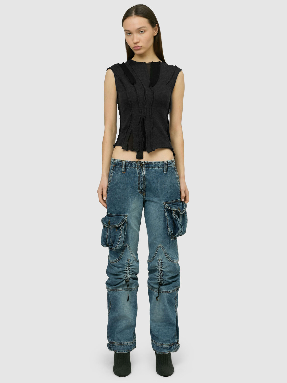 Black and grey deconstructed knit top with sheer mesh inserts.