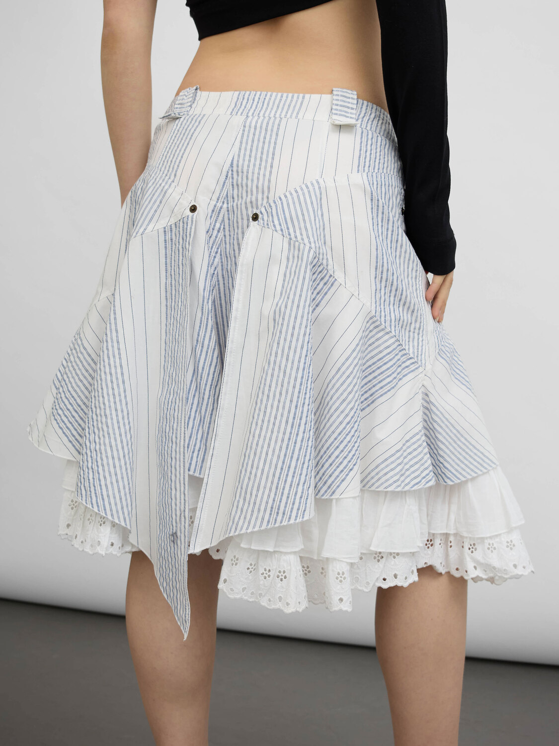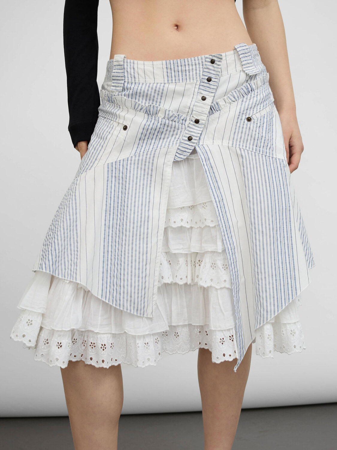 Blue and white striped deconstructed midi skirt. Broderie anglaise details. Concealed zipper closure on the side.