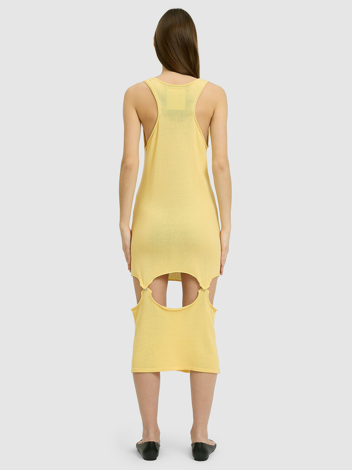 Ann-Sofie Back banana yellow knitted maxi dress from the AW 2002 collection. Cutout details above the knee height.