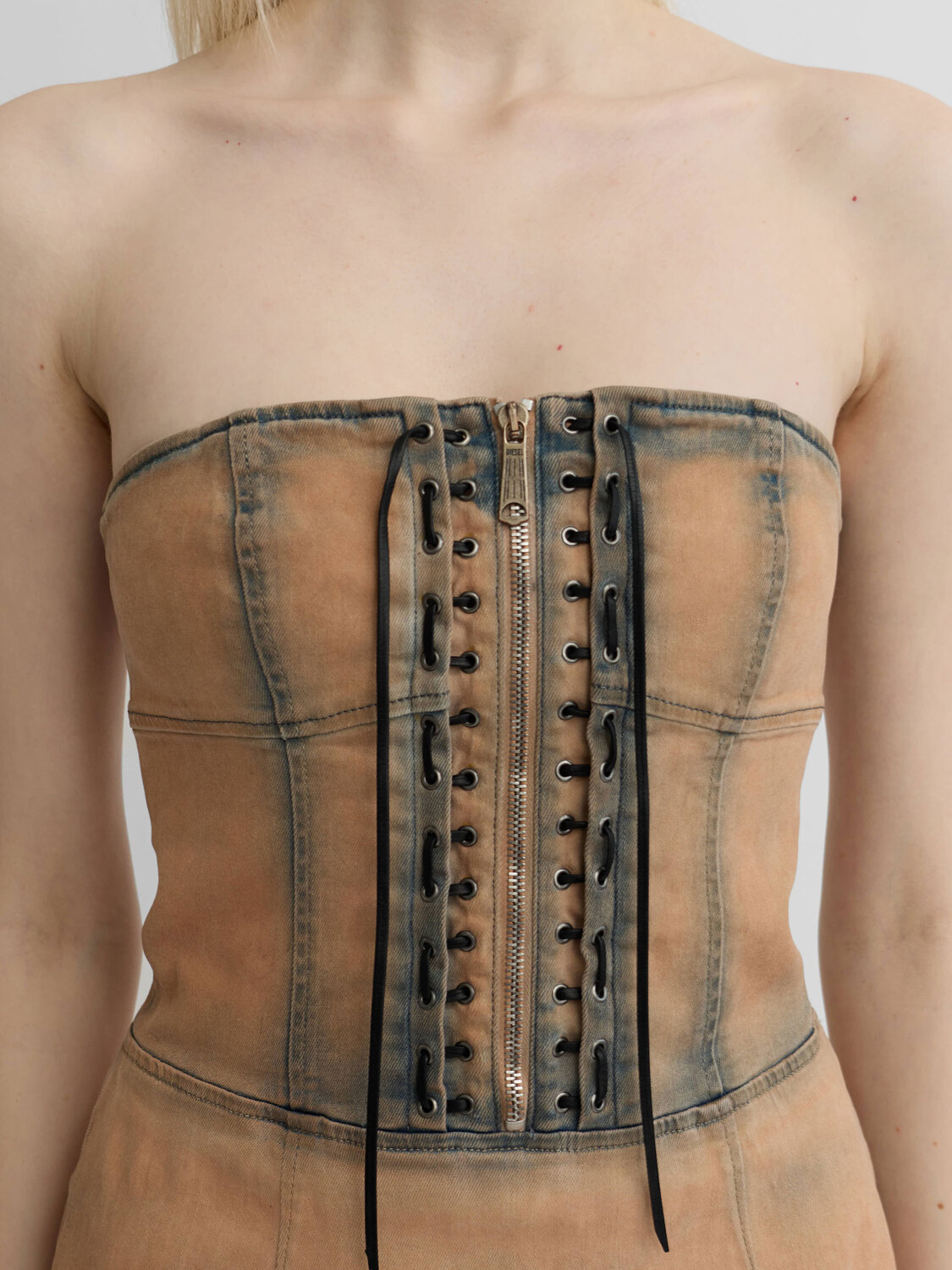 Diesel apricot pink denim mini dress featuring zip closure and decorative lacing at the front, beige raw-edge lining peeking out at the bottom.