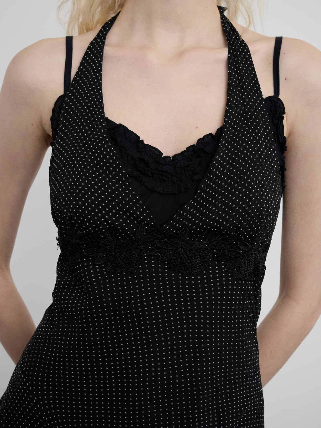 Black bustier camisole slip dress with a layered ruffled hem and trim, and a gathered detail at the back. Comes with an inner polka dot chiffon halter dress featuring a floral appliqué, a lace-up detail at the back, and an asymmetrical hem.