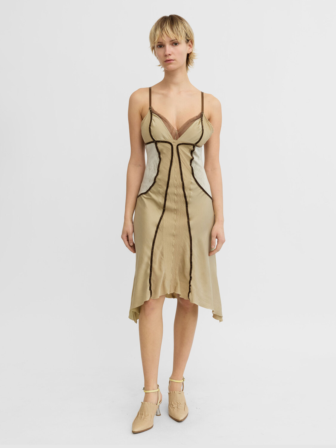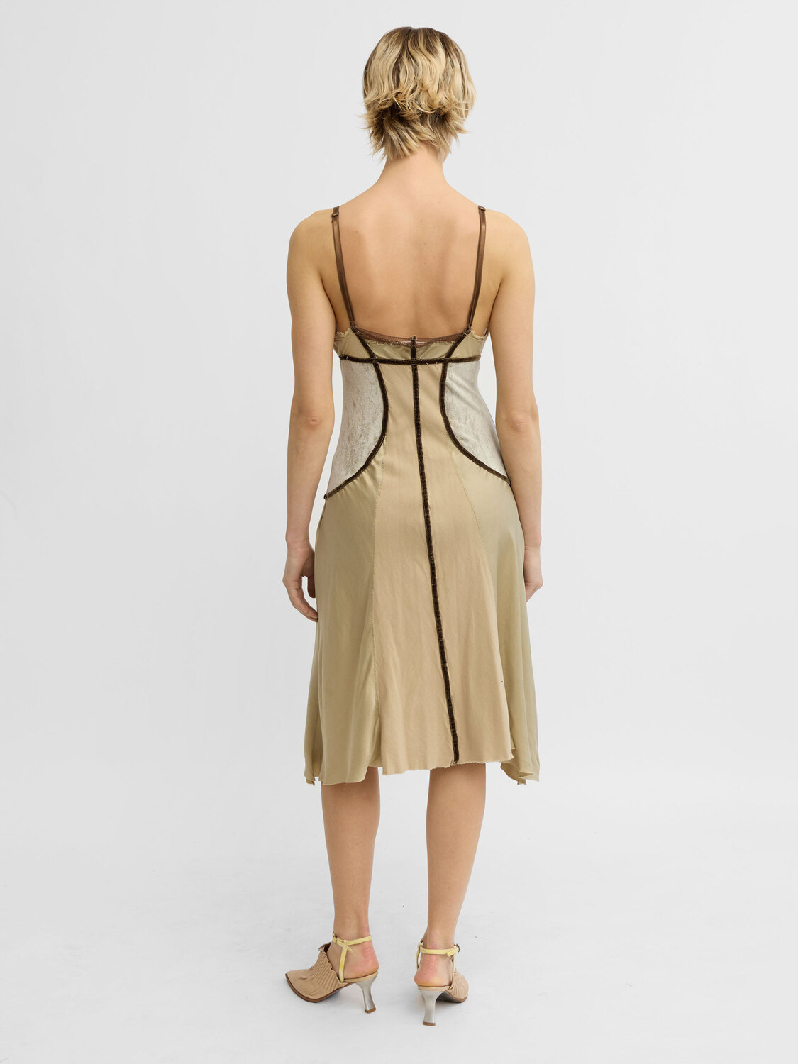 Nolita olive silk midi dress with brown velvet piping and grey plush sides.