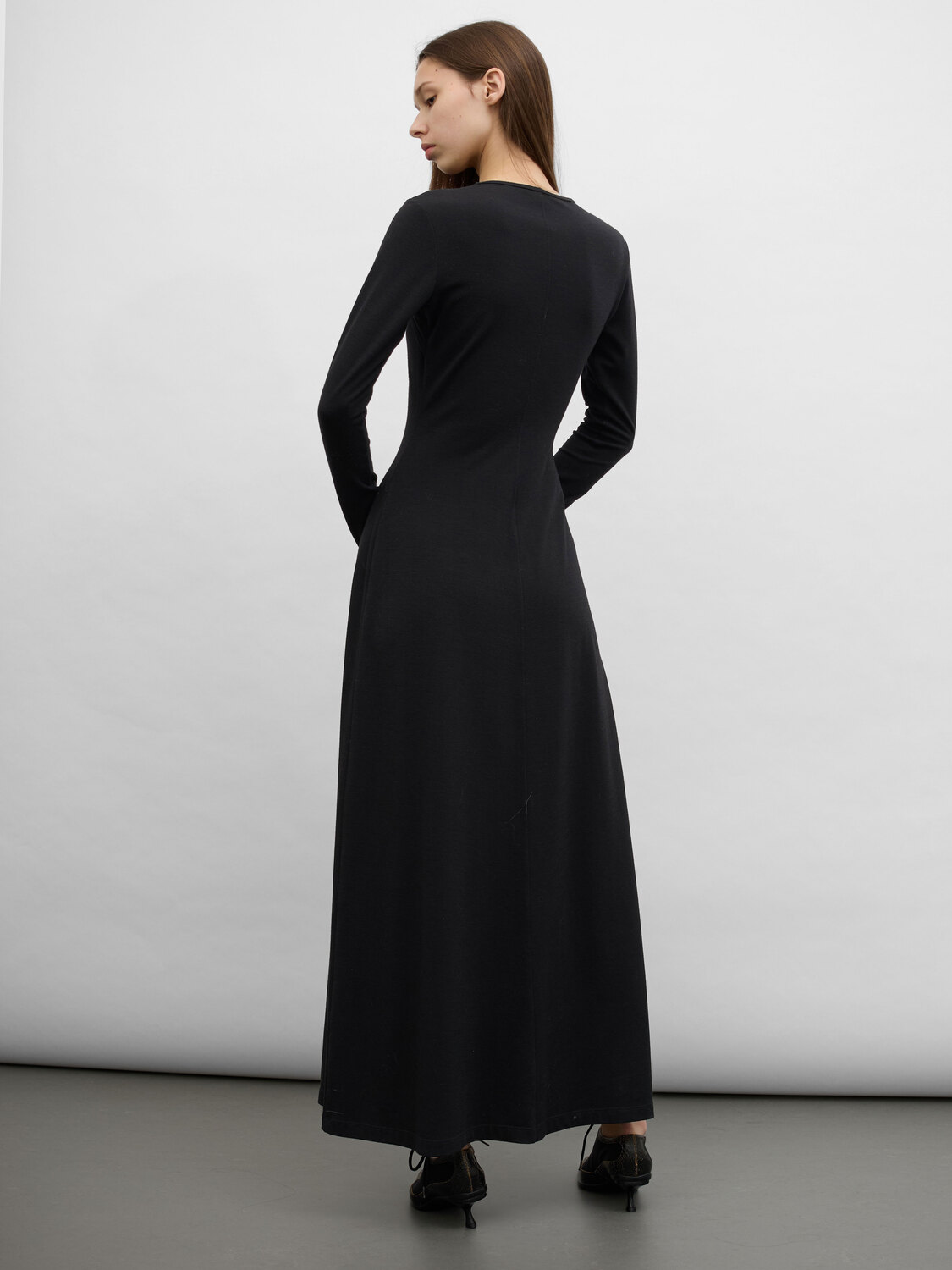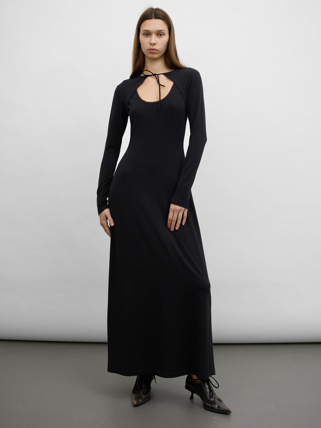 Plein Sud black long-sleeve maxi dress with an integrated tie-up mantle and crochet trim scoop neck.
