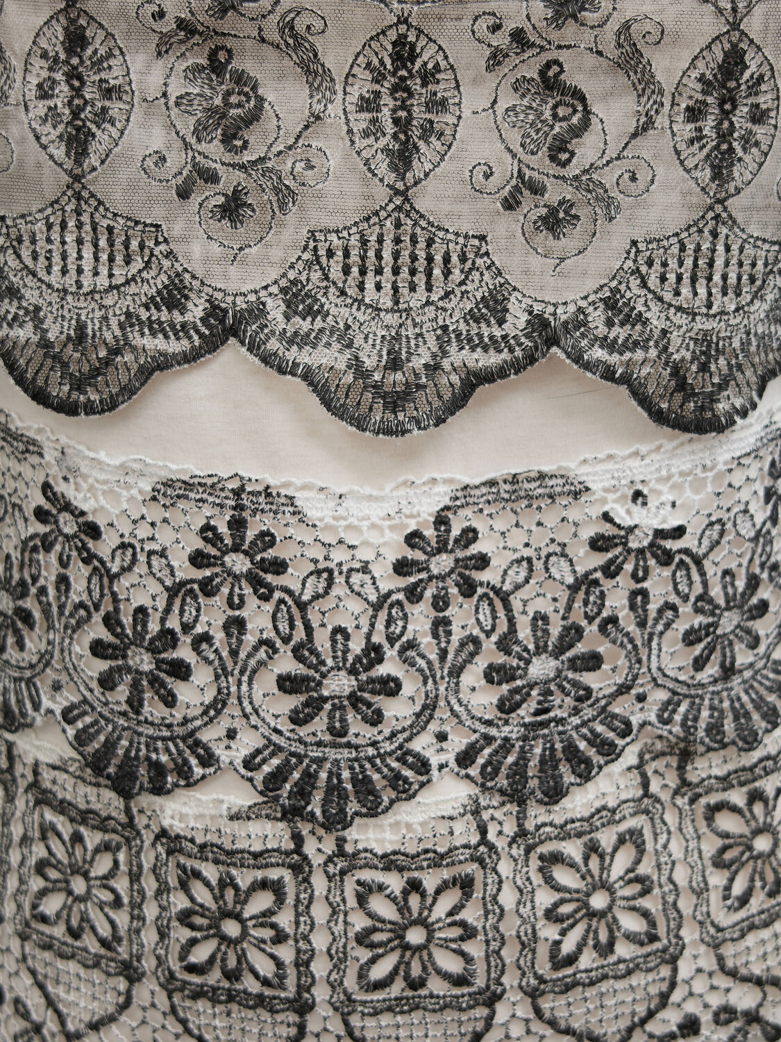 E-Play black and white sleeveless mini dress with floral lace and mesh details.
