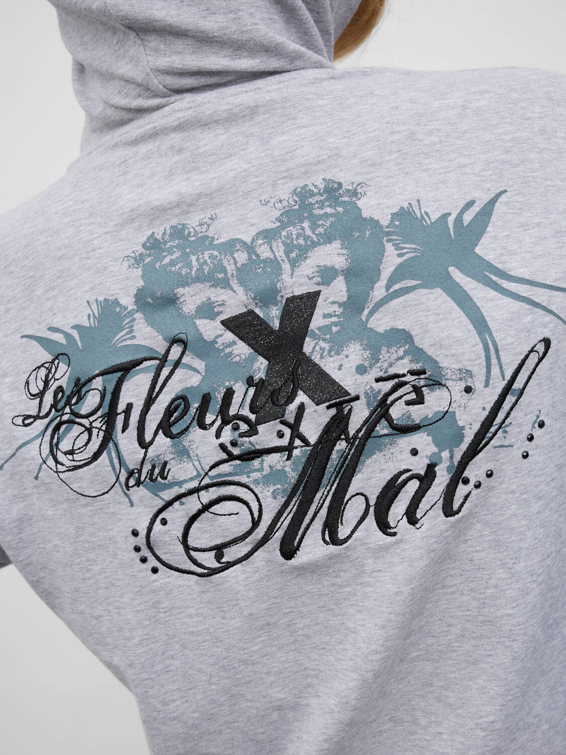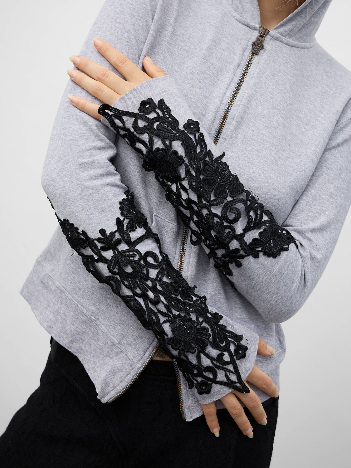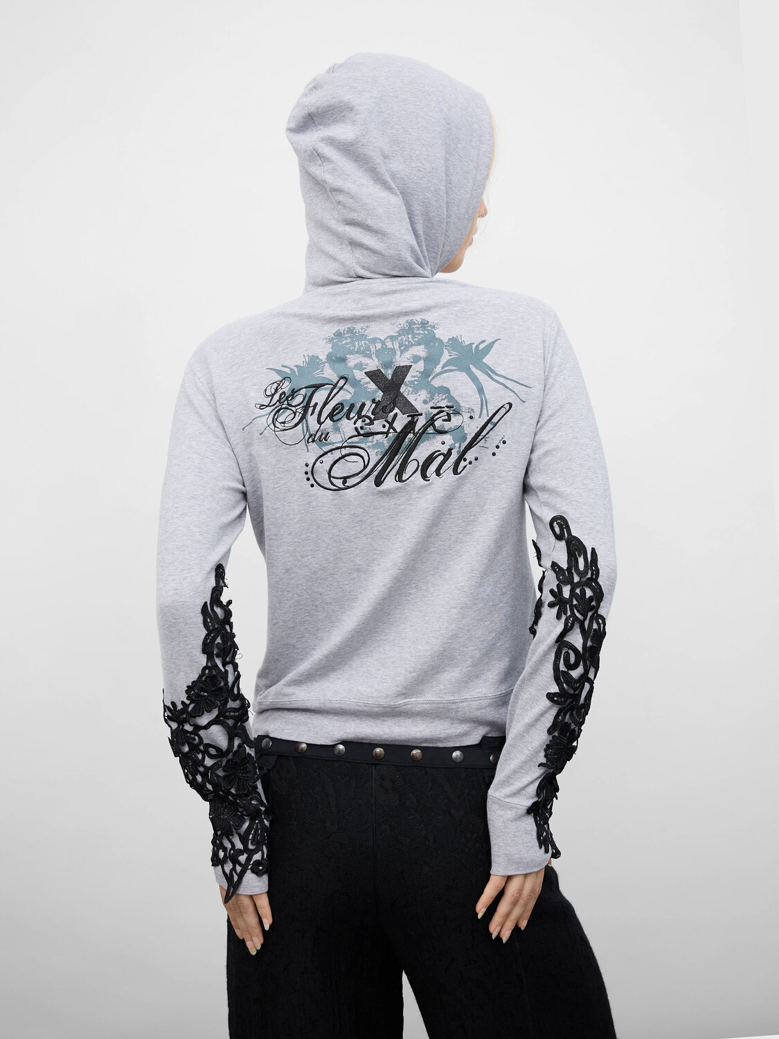 Extē grey stretchy cotton zip-up hoodie with black floral lace appliqués and embroidery at the back.