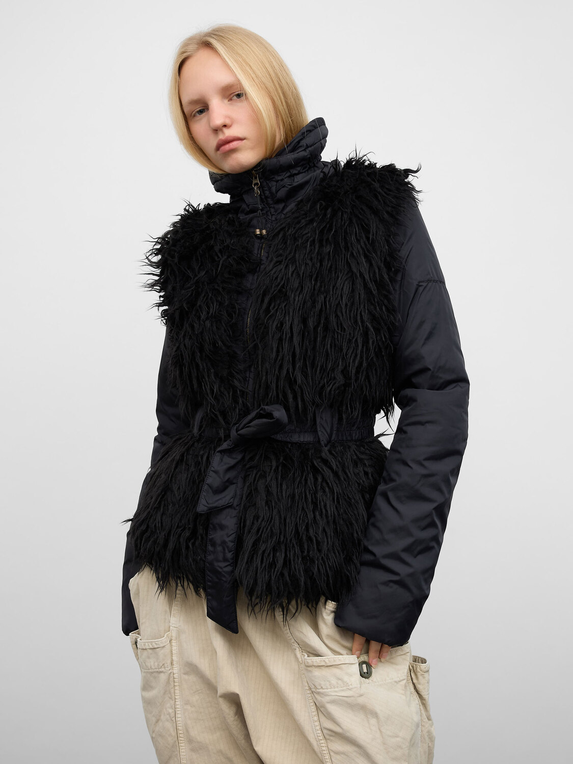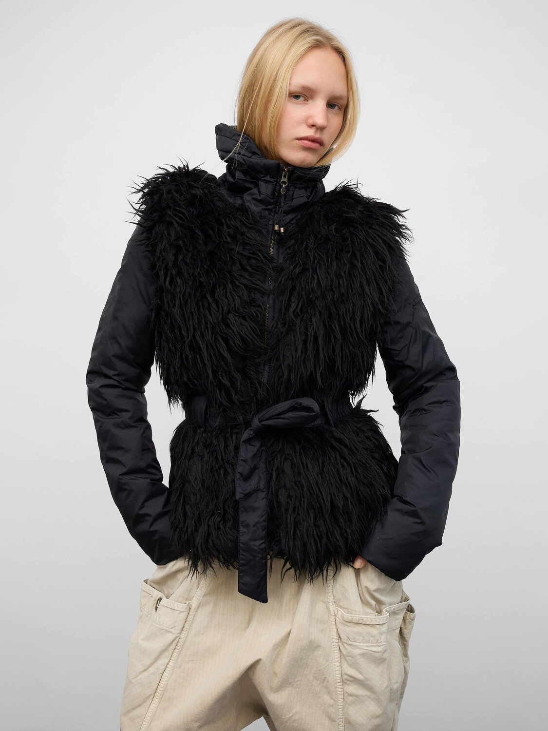 Fornarina black nylon fuzzy zip-up jacket with an integrated belt.