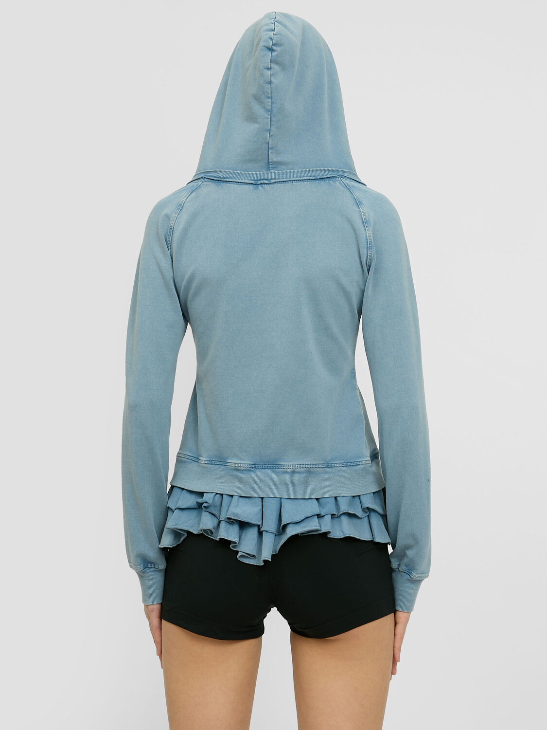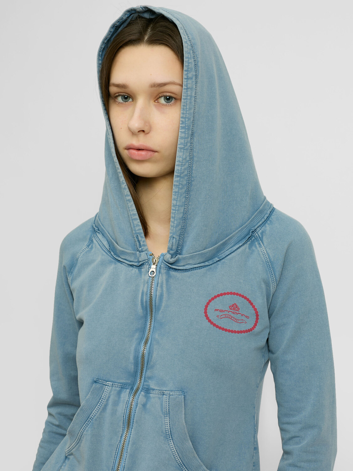Fornarina blue acid wash zip-up hoodie with pockets and a red logo print. Ruffled detail at the hem.