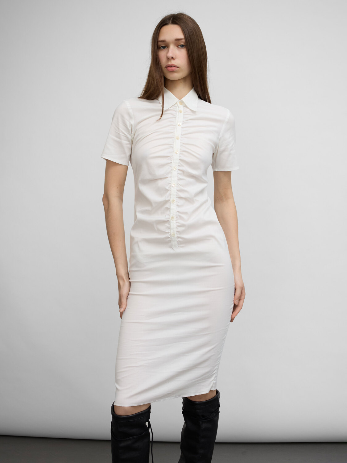 Jean Colonna white cotton shirt-style short sleeve button-up dress with a gathered effect.