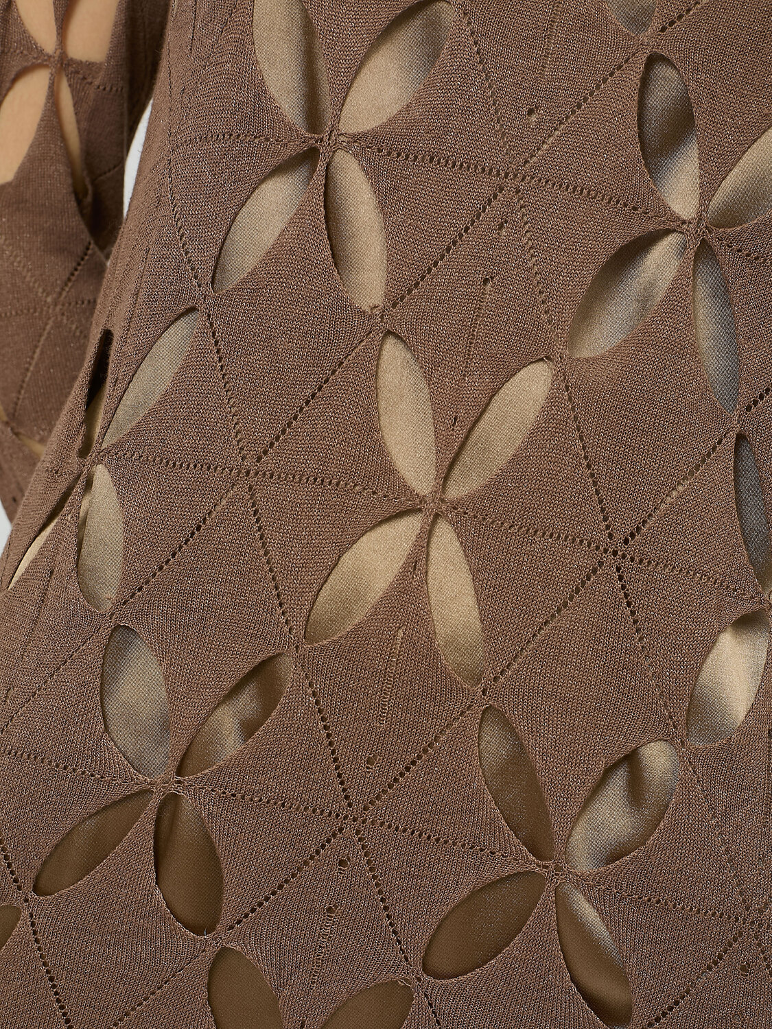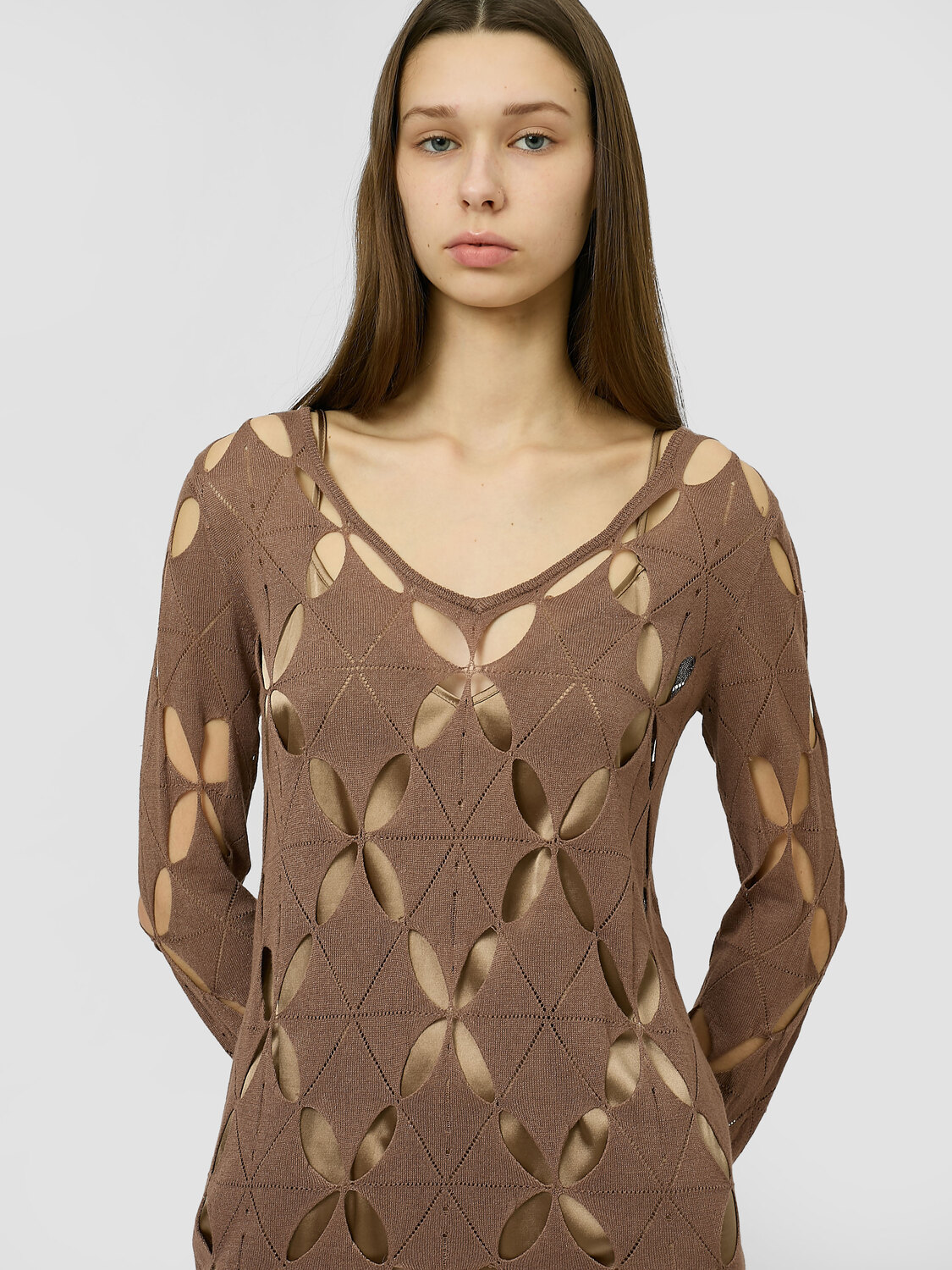 John Galliano taupe open-knit mini dress with cutout ornament details and a bronze satin chemise that can be worn separately.