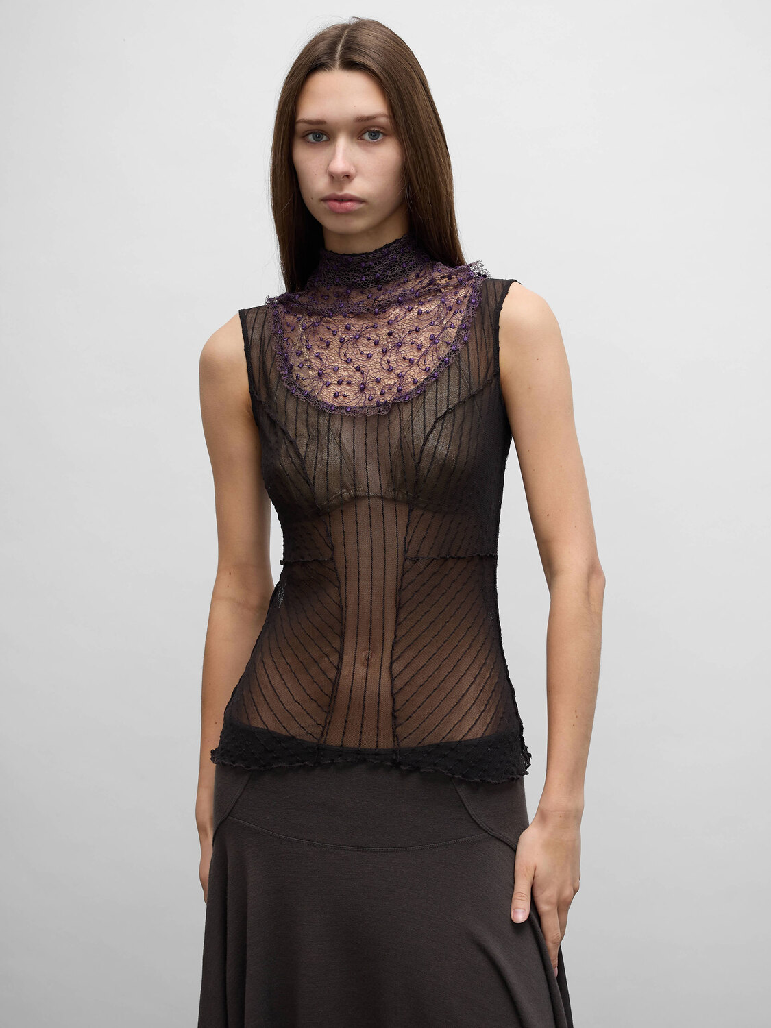 Brown stretchy mesh top with a lilac embroidered lace collar, snap button closure at the back, and inside-out overlock hems.