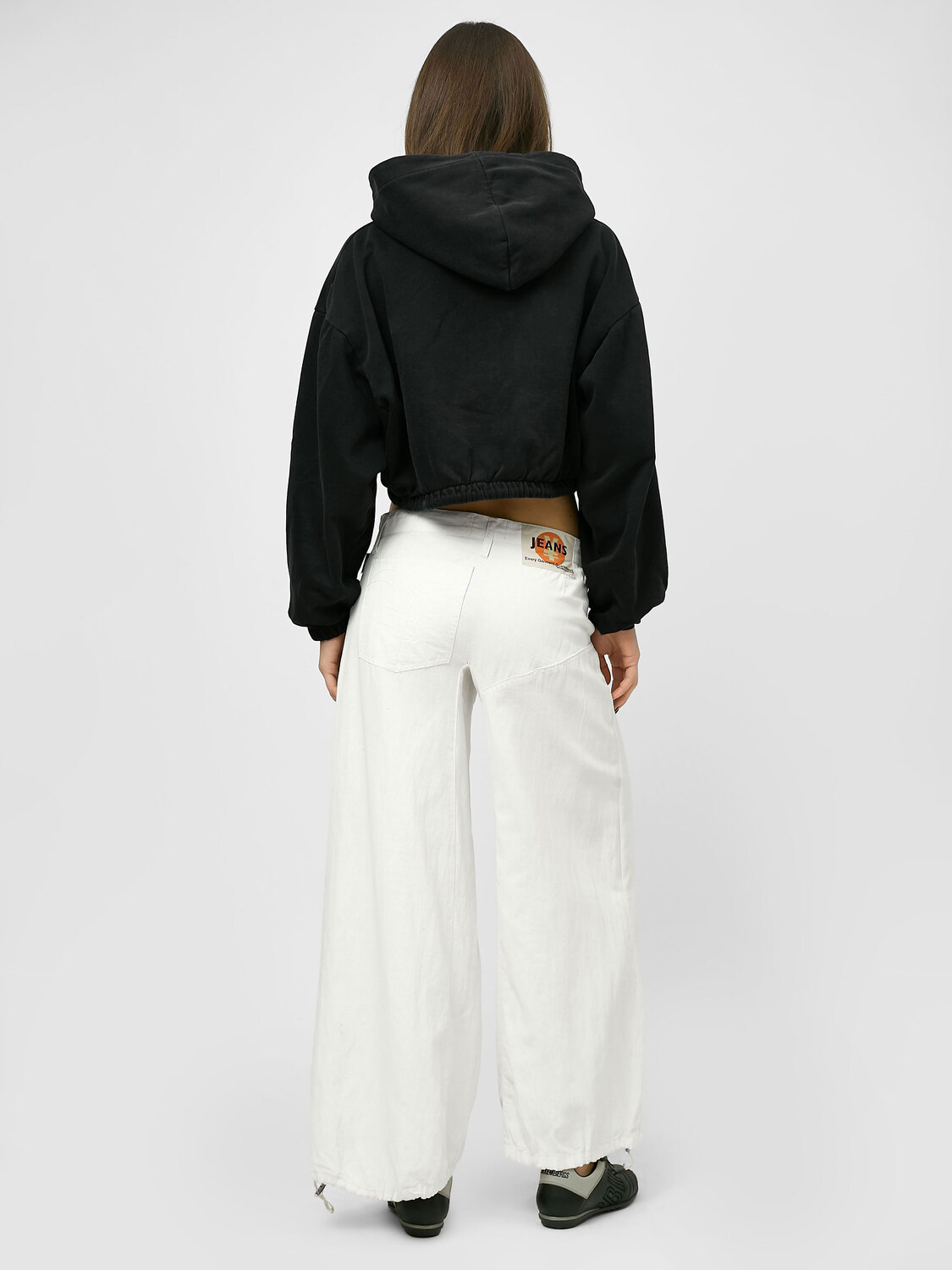 Michiko Koshino white wide-leg deconstructed trousers in lightweight cotton-linen blend with a logo embroidery on the rear pocket and drawstrings at leg openings.