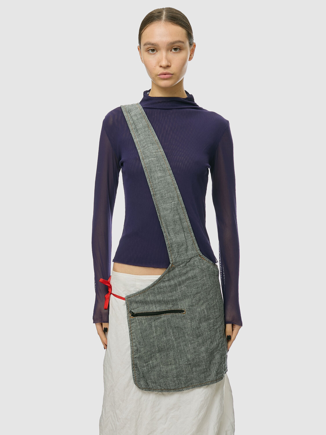Miss Sixty denim apron-style double sided bag with multiple pockets and ties. Can be worn in various ways.