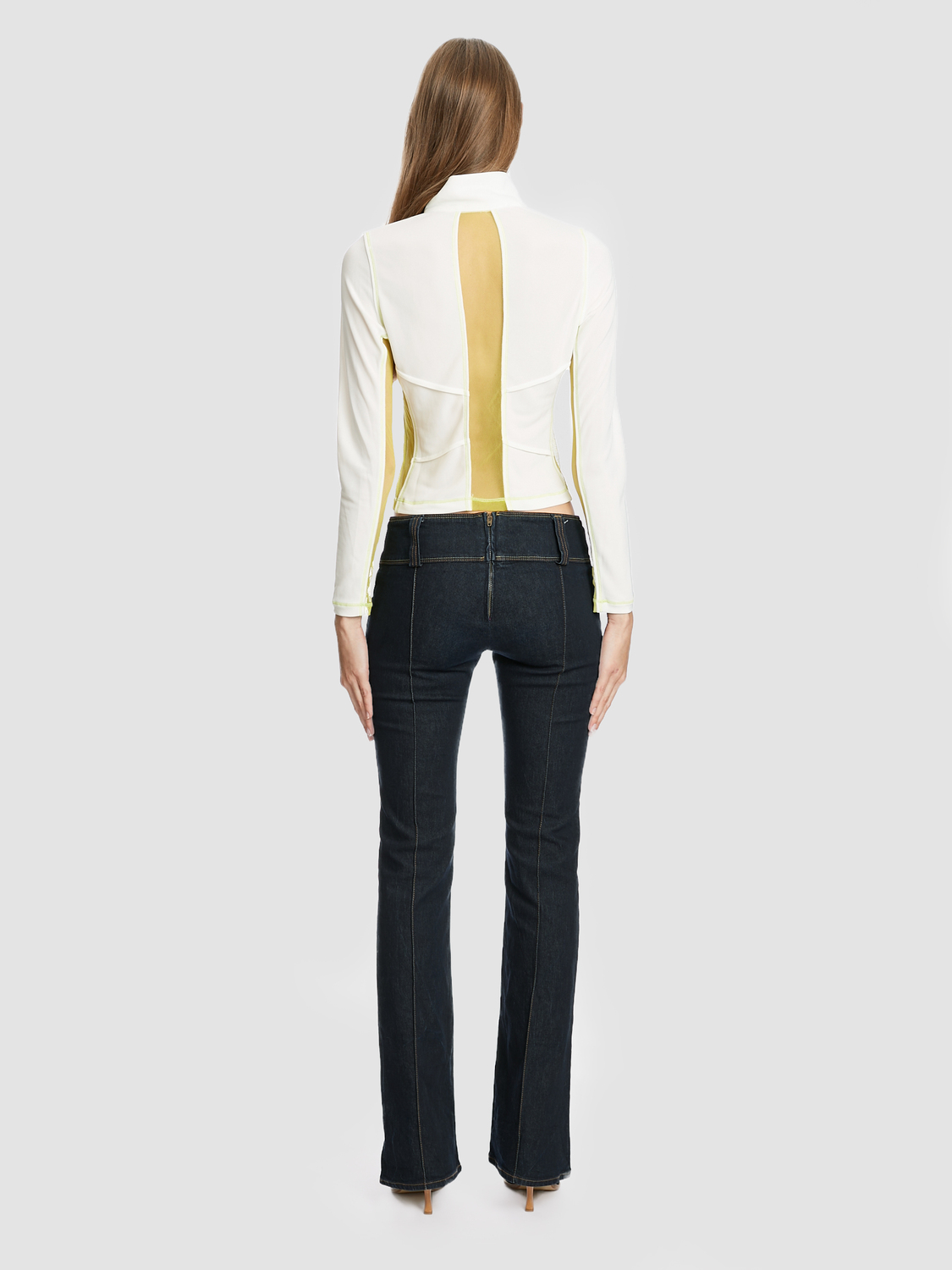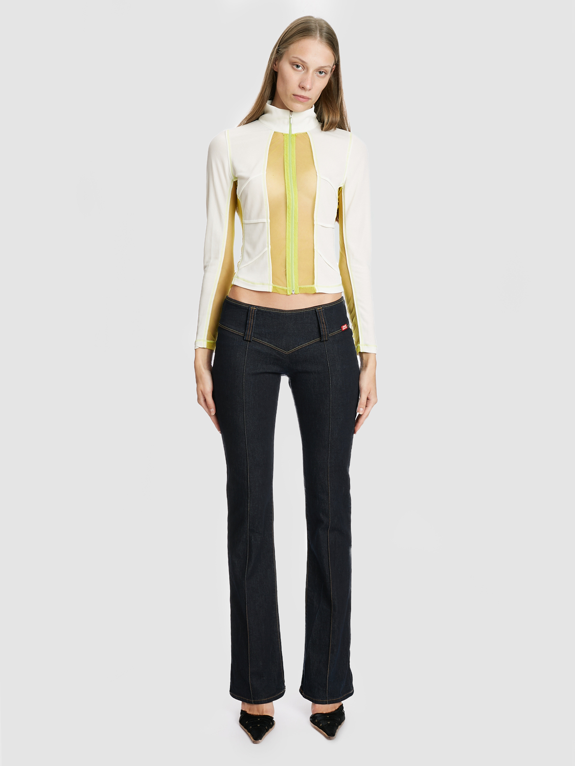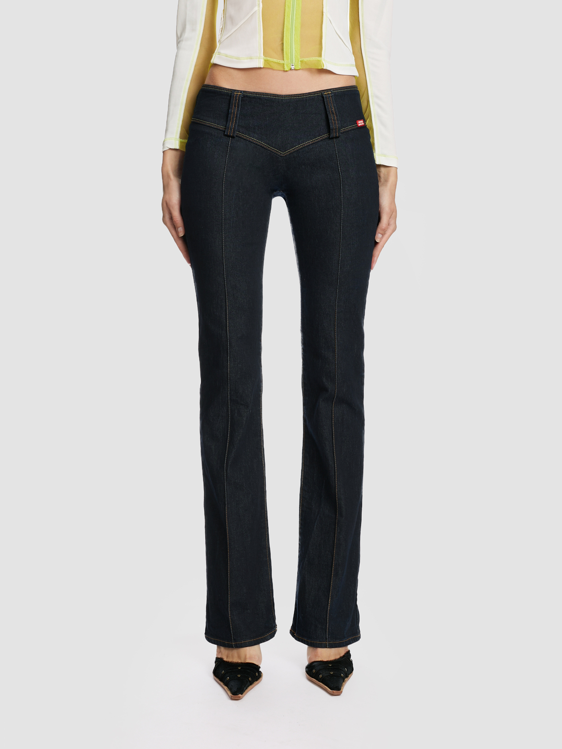 Miss Sixty Nixie stretchy dark blue slightly flared low-rise jeans with zipper and snap button closure at the back.