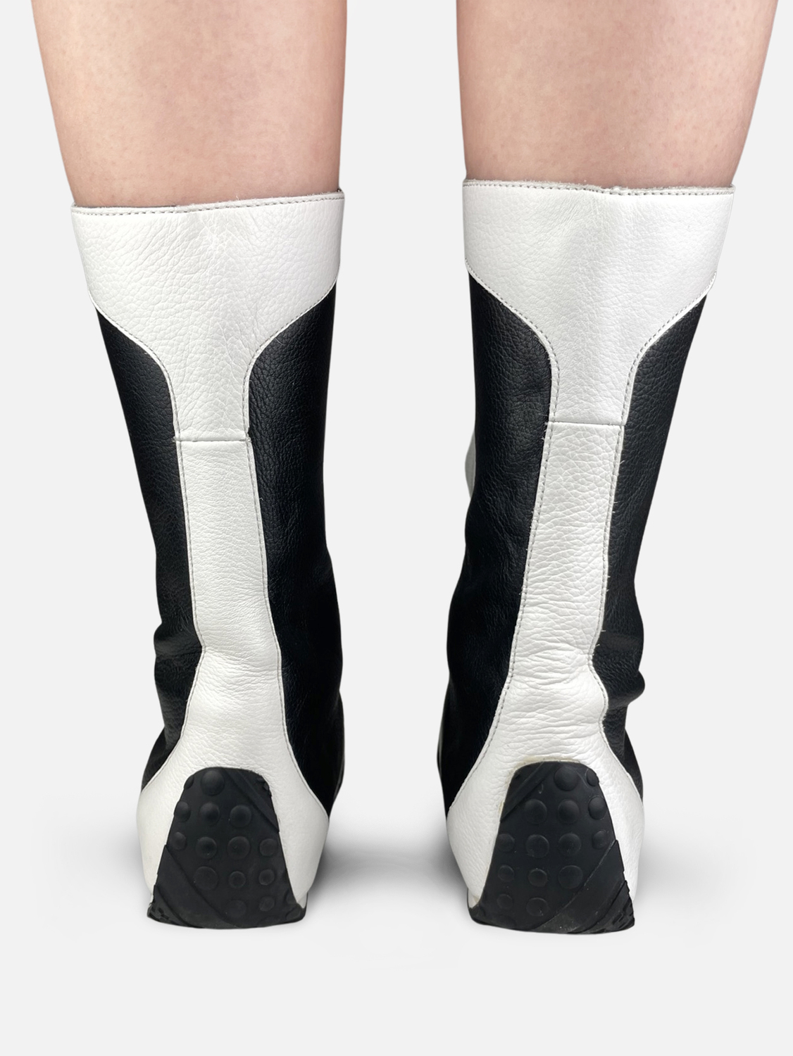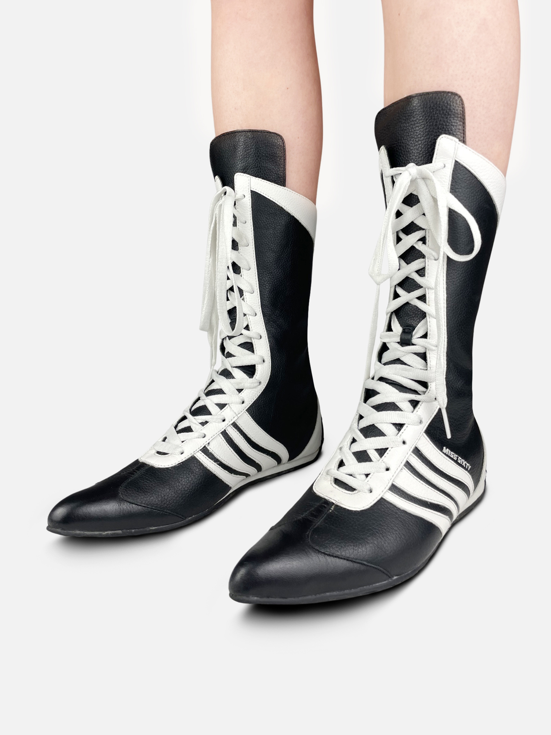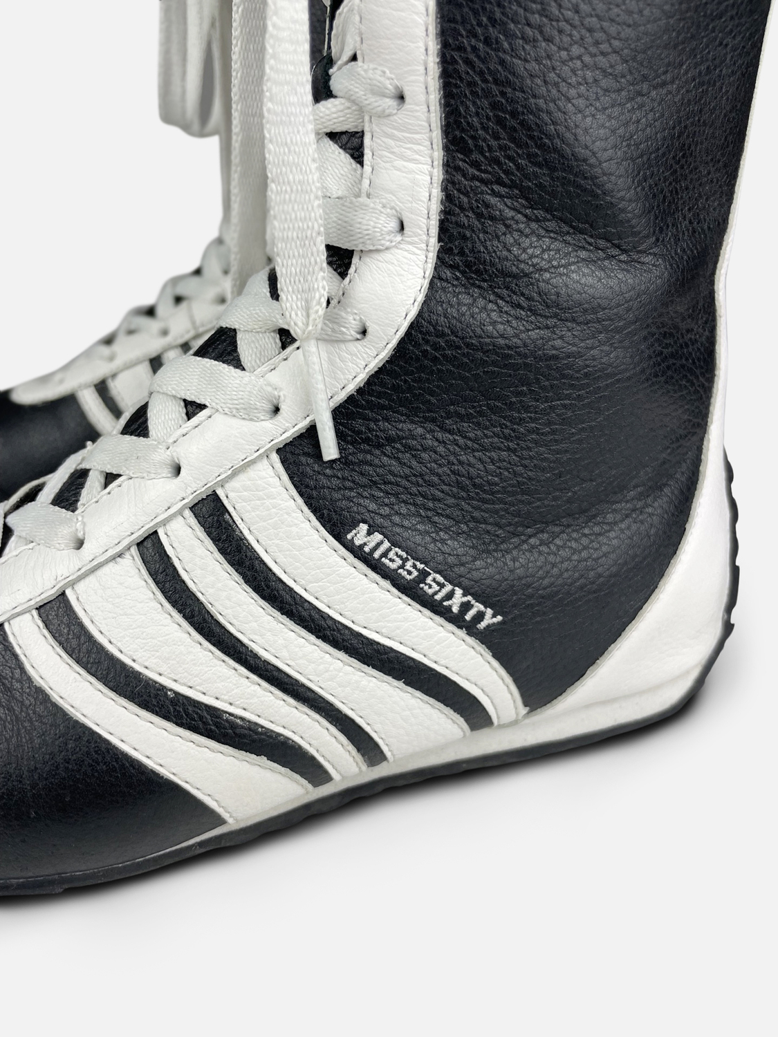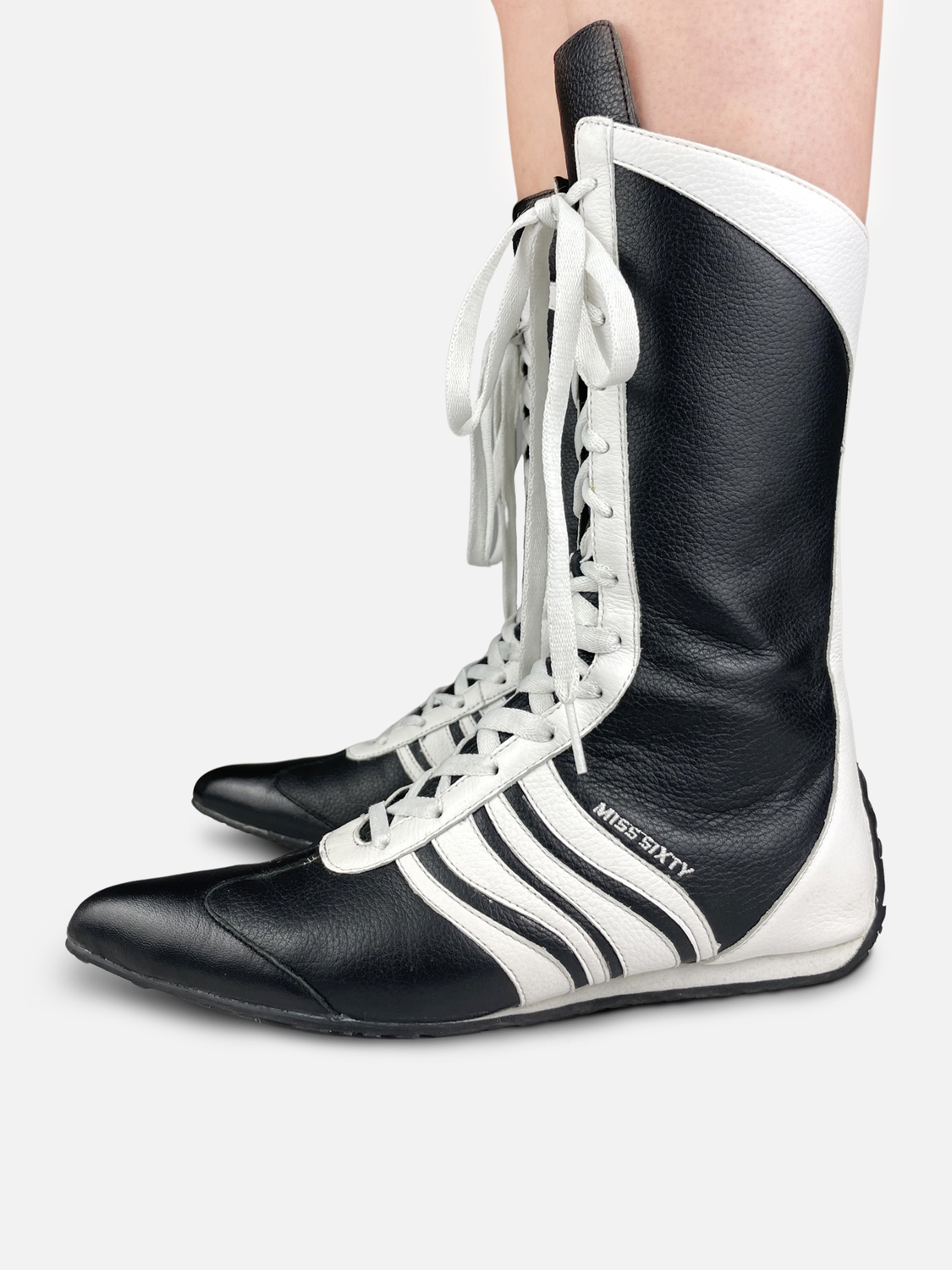 Miss Sixty black and white pointed toe lace-up sneaker boots. White weavy stripes on the sides. Small logo embodiered on the side. Rubber soles.