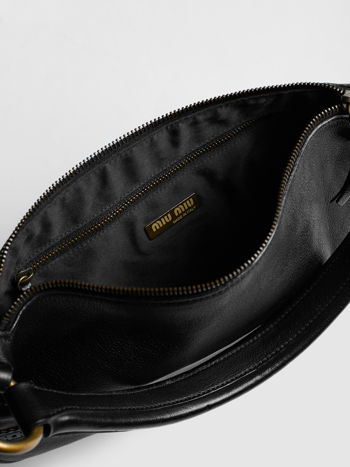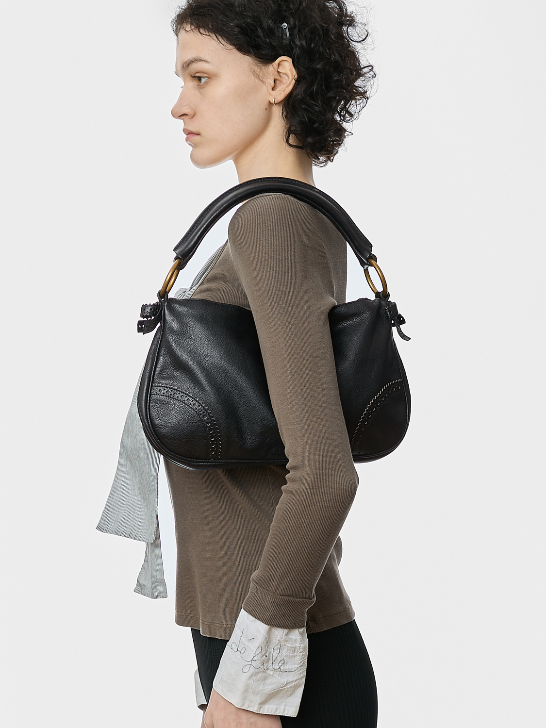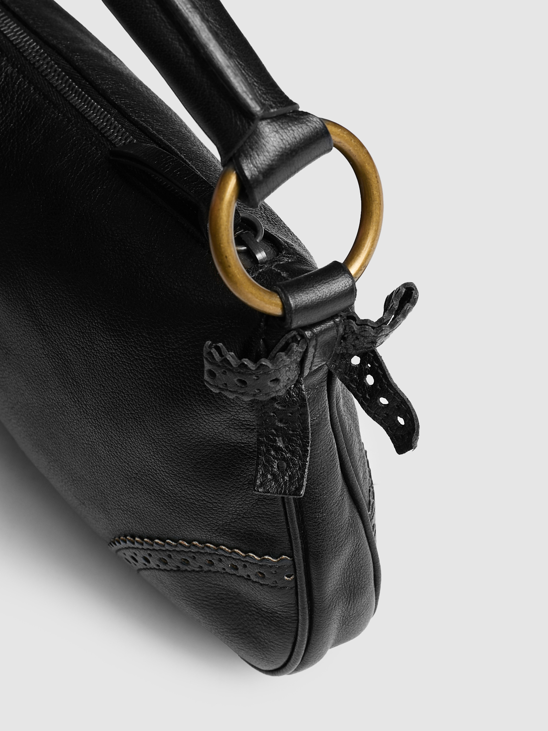 Miu Miu black leather brogue handbag with brass-tone hardware. Zip-up top closure. Black fabric lining with zippered interior pocket.