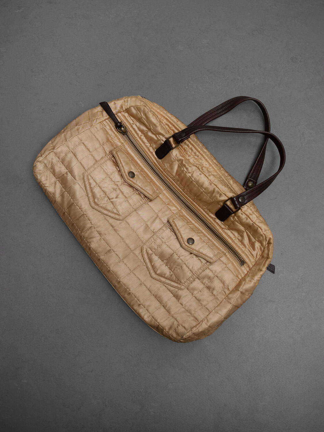Miu Miu quilted handbag in champagne colour satin material. Brown leather handles. Zip-up top closure. Two small pockets with snap button closure at the front.
