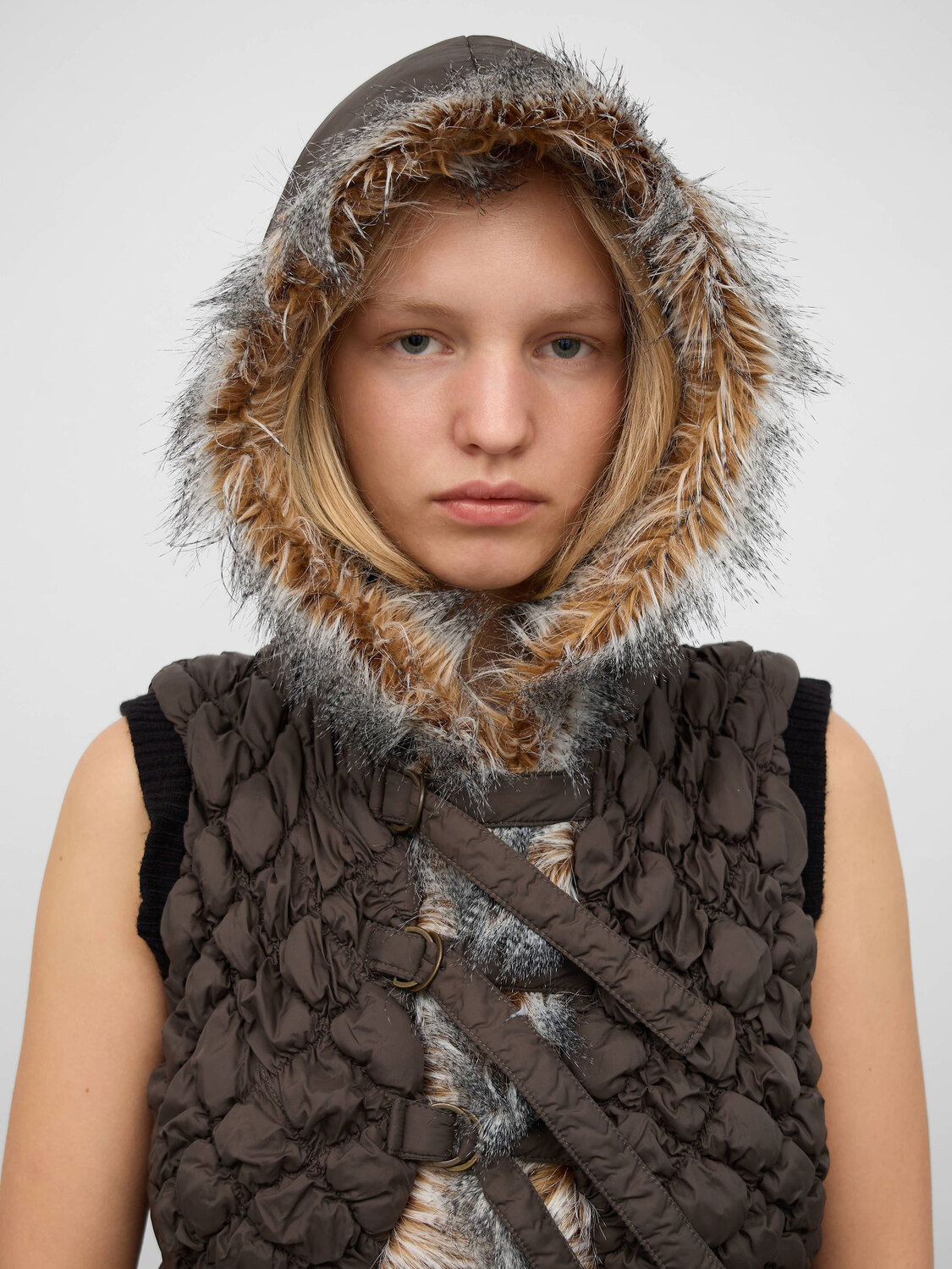 Brown nylon bubble effect hooded puffer vest with faux fur trim. Large cargo pockets around the waist. Closes with two snap buttons and adjustable belts.