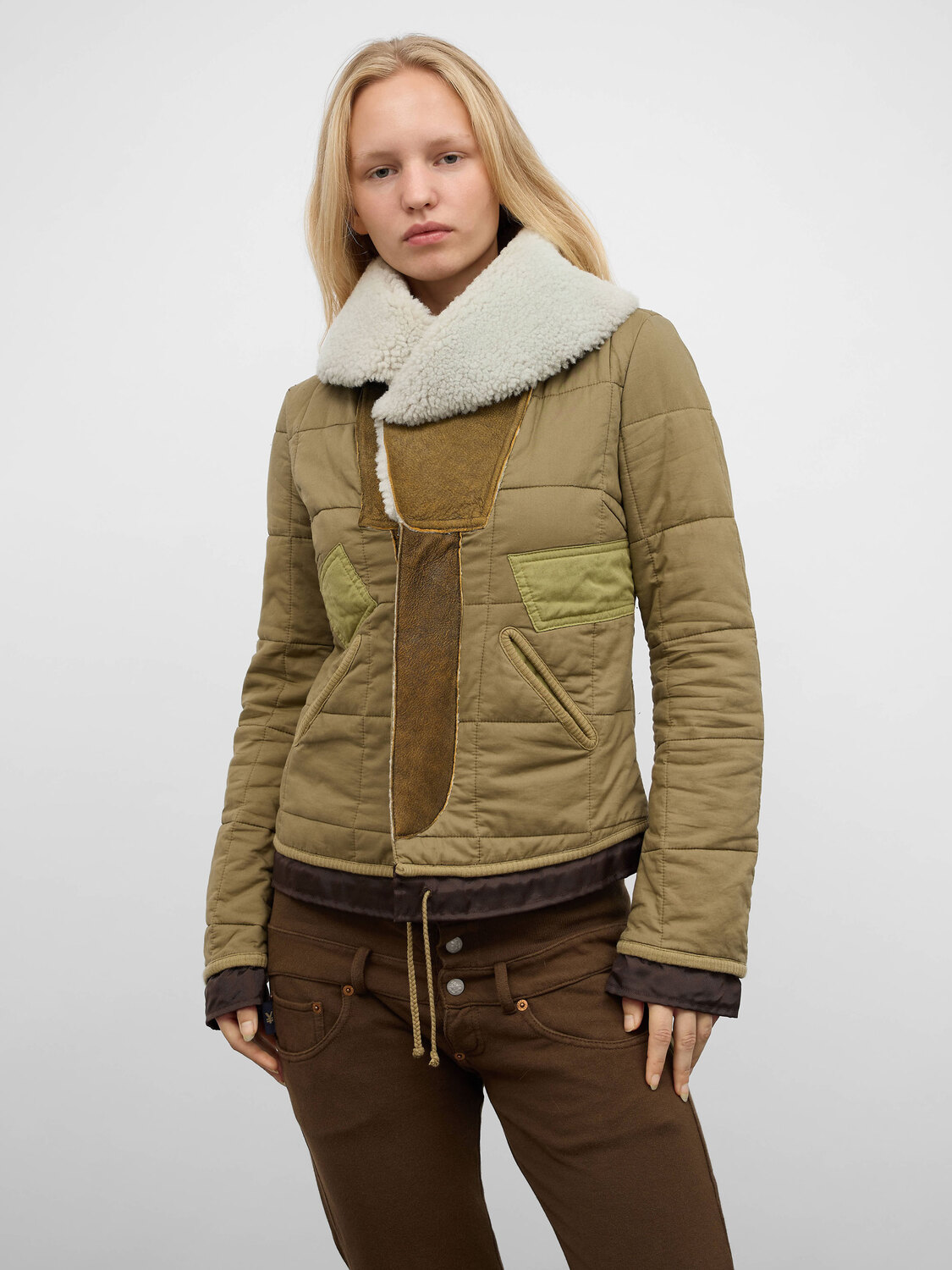 Diesel khaki green cotton padded jacket featuring faux suede / sherpa collar, nylon panel at the bottom with drawstring and zipper closure.