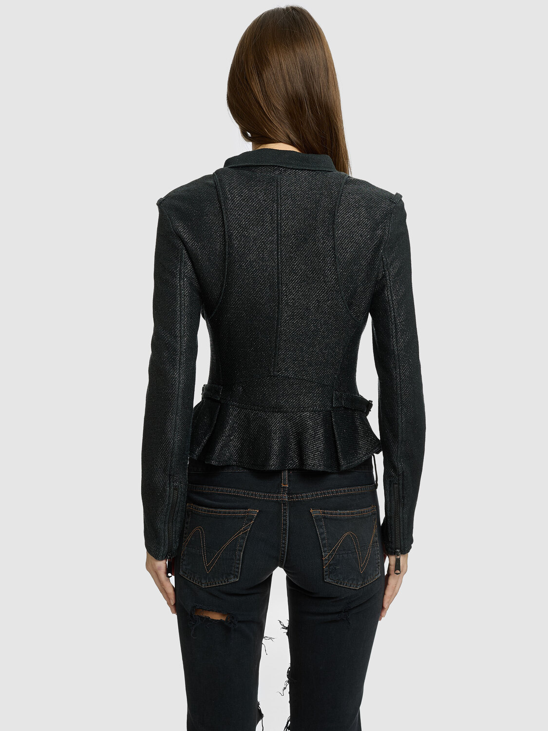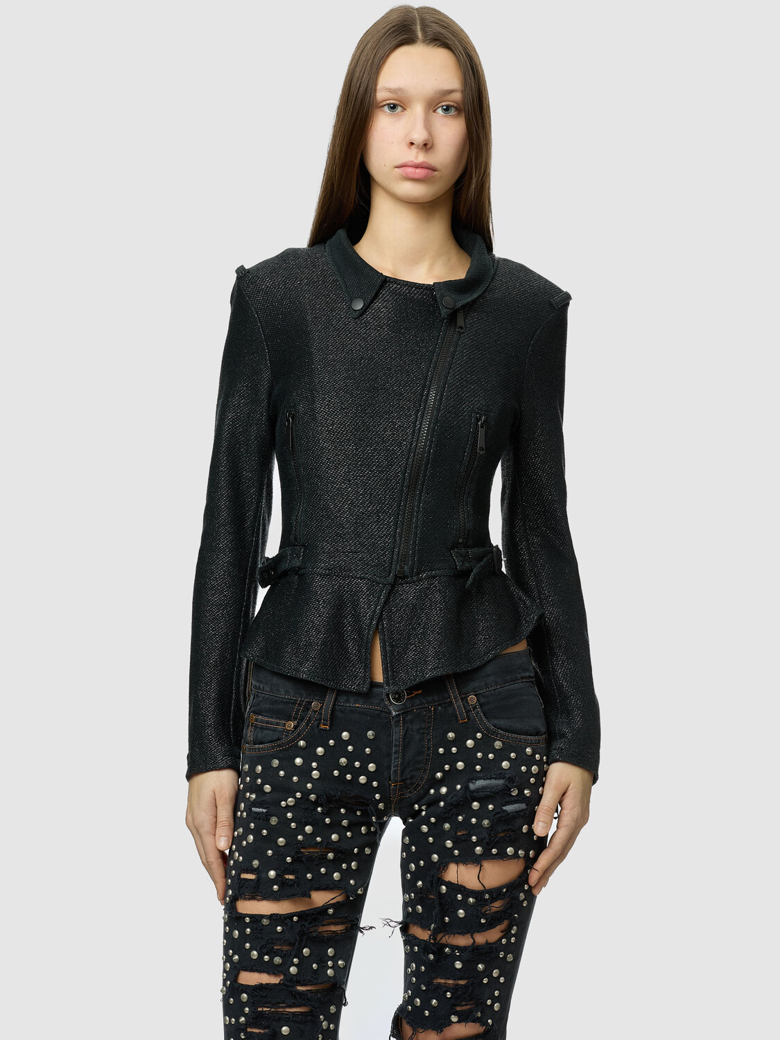 Diesel metal effect jacket featuring asymmetric zip-closure, two zip pockets at front, two adjustable straps on sides, and pleated details at back.