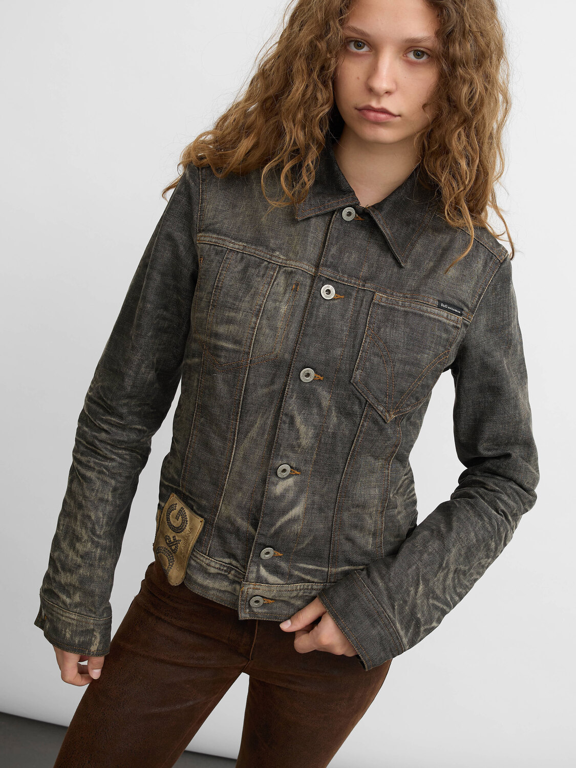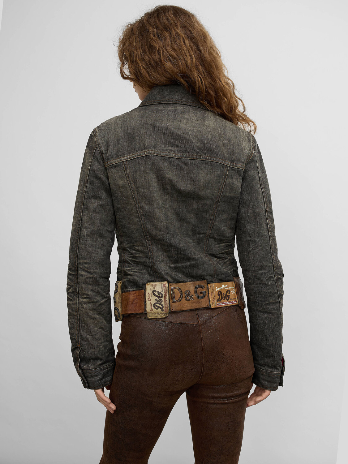 Dolce & Gabbana (D&G line) jacket in a charcoal denim wash. Patchwork design with leather label logos around the waist.