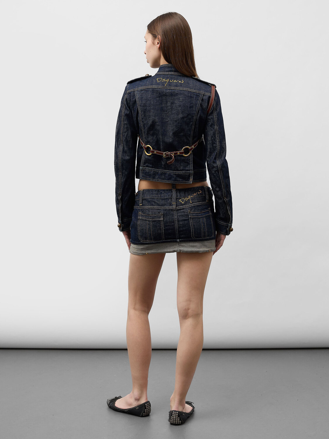 Dsquared² FW2003 navy blue denim jacket featuring brown leather harness with gold-tone metal hardware. Logo embroidery on the back. Contrast yellow stitching. Large brass-tone metal ball buttons.