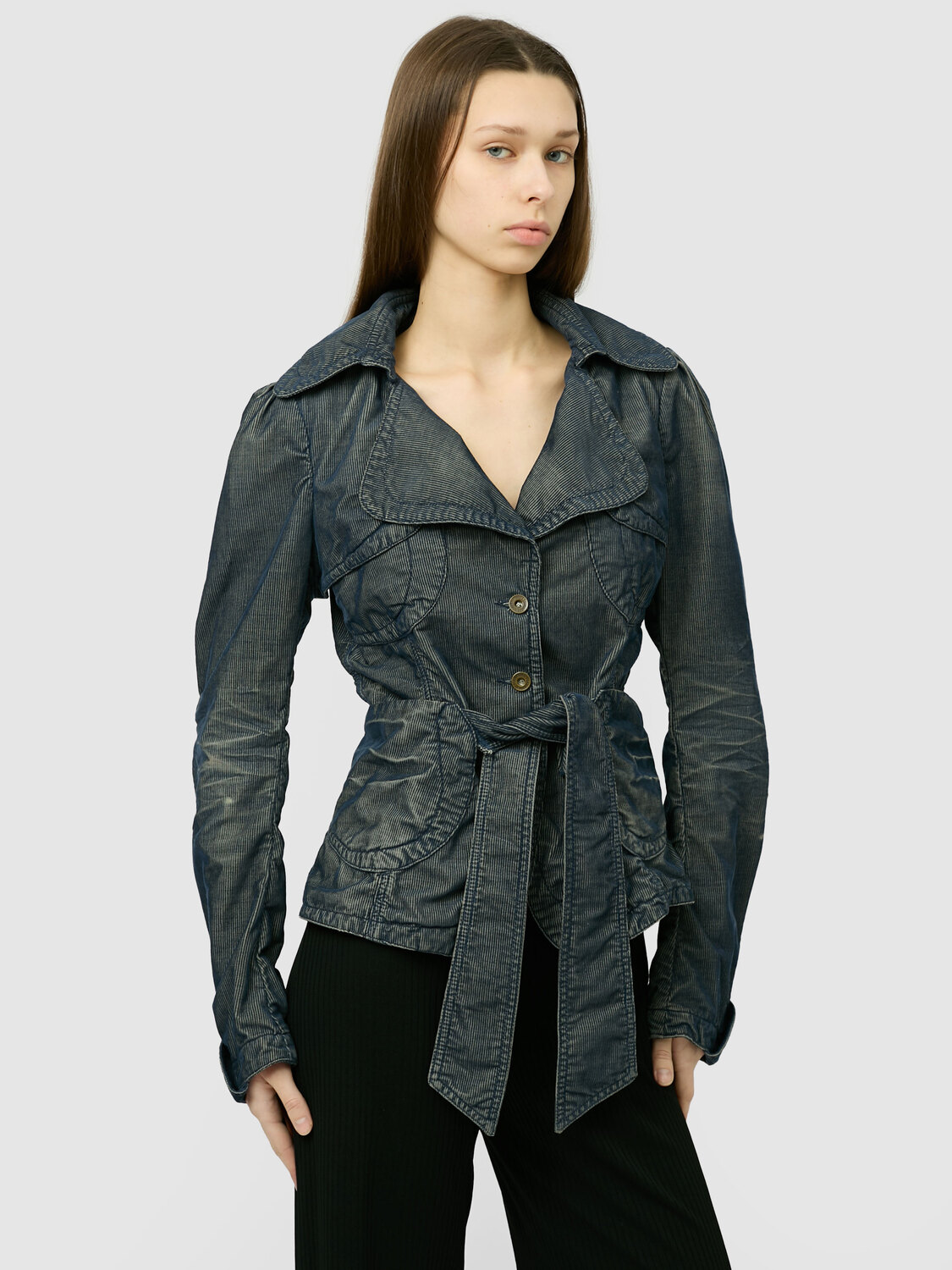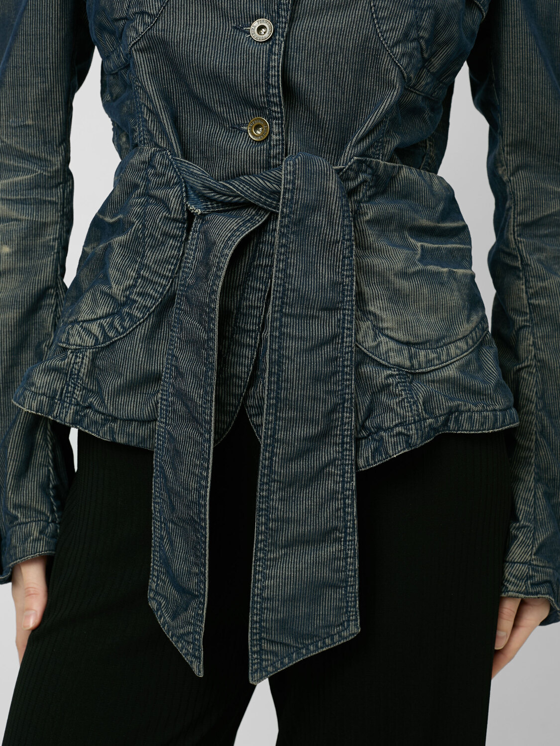Fornarina blue and grey acid wash corduroy jacket with multiple pockets and an integrated belt.