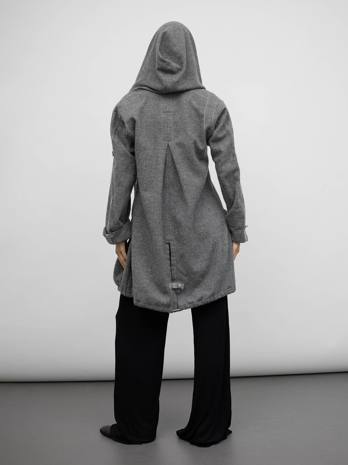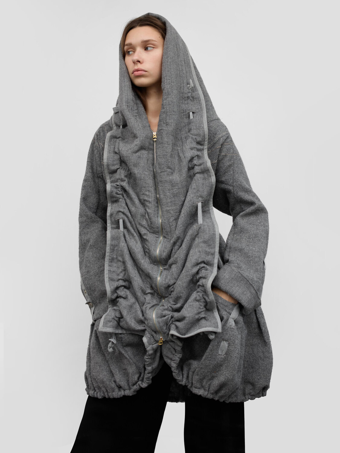 Marithé+François Girbaud grey wool felt hooded coat. Canvas straps. Gathered details. Zipper closure.