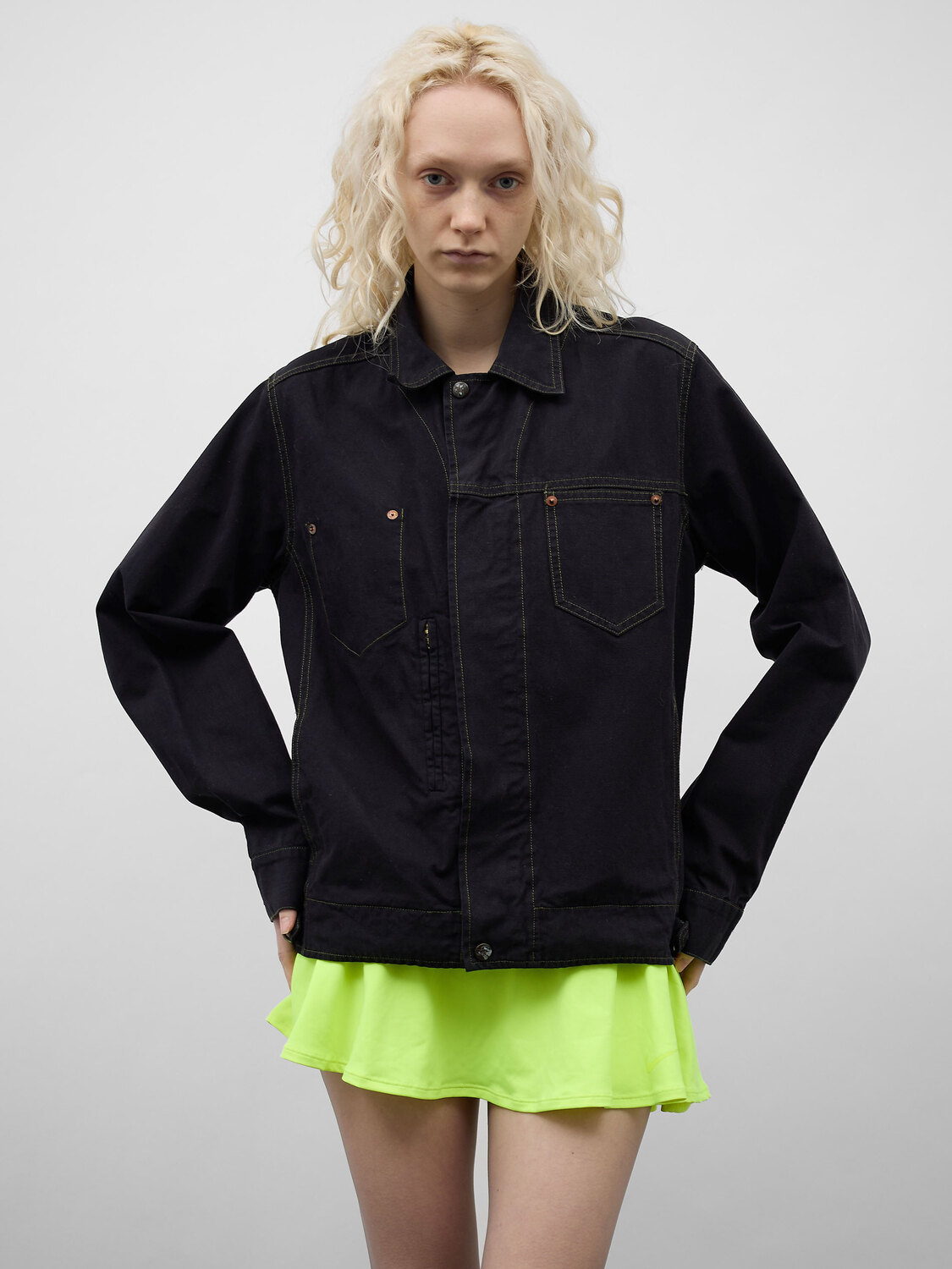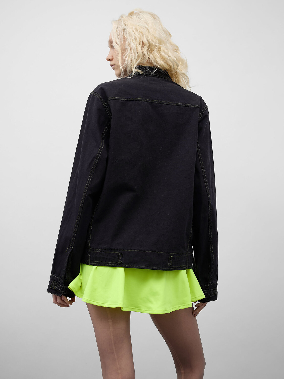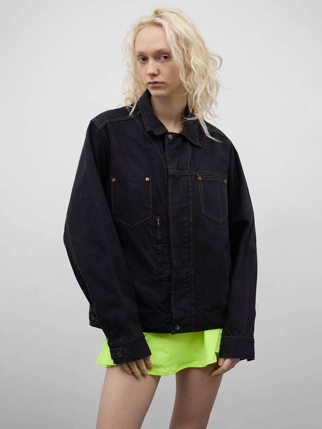 Michiko Koshino black oversized fit denim jacket with contrast green stitching. Multiple pockets. Zip and snap button closure.