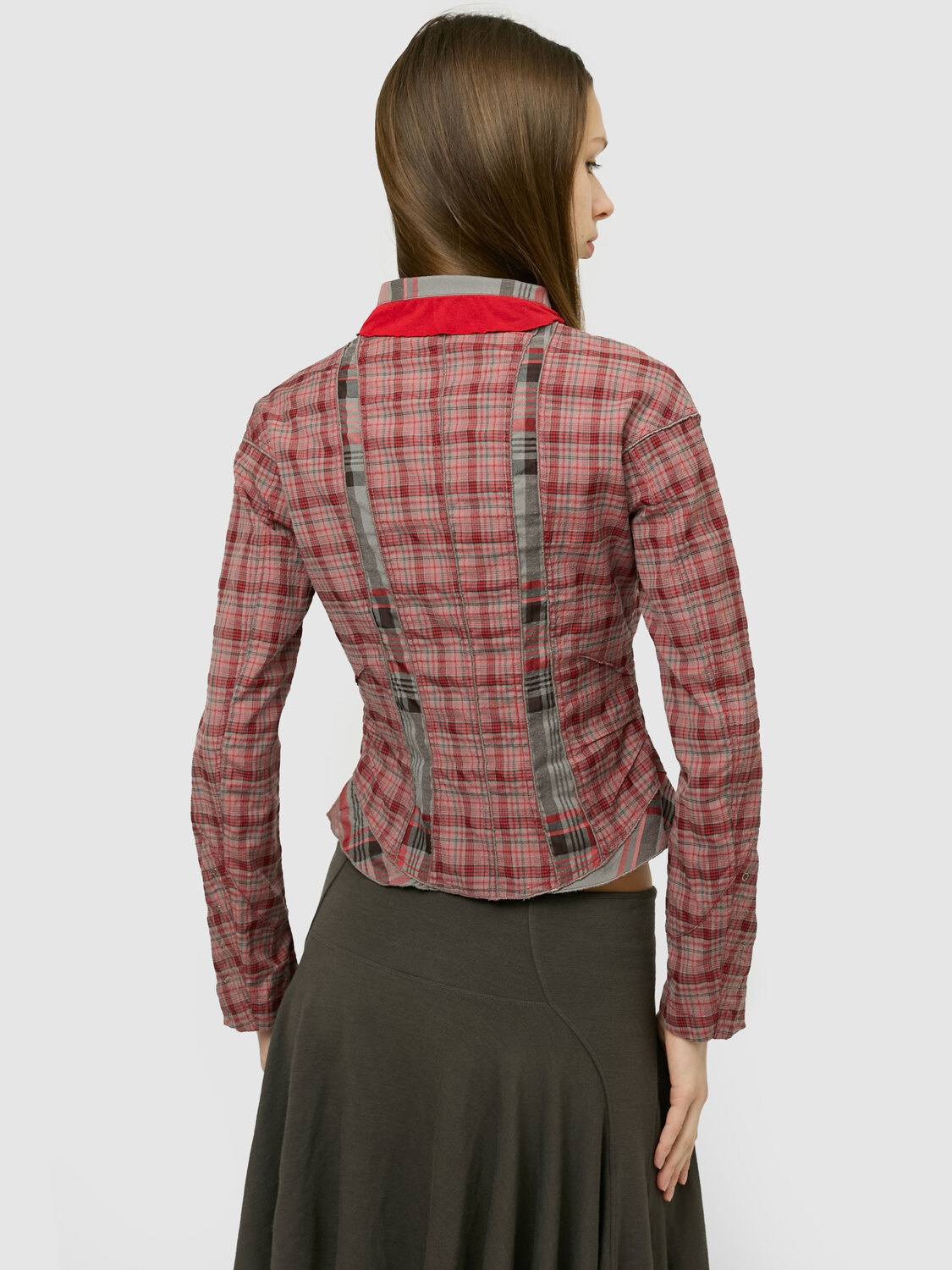 Red and grey gingham check patchwork shirt. Gathered and dart details. Snap button closure.