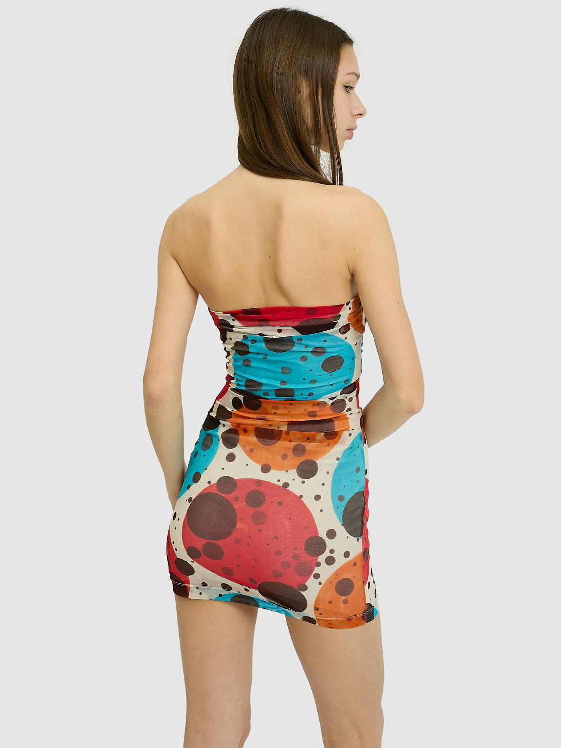 Plein Sud strapless dress in sheer stretchy mesh material featuring gathered details and a multi-coloured graphic print.