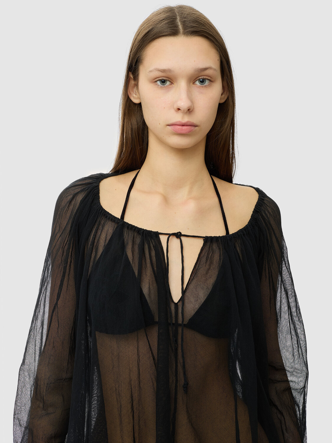 Plein Sud black mesh off-shoulder blouse with adjustable gathered collar and cuffs.